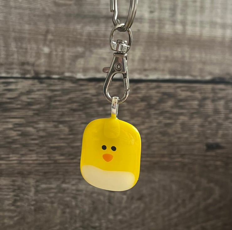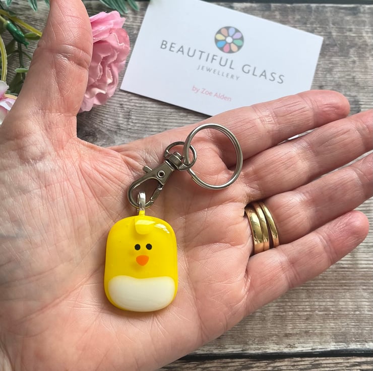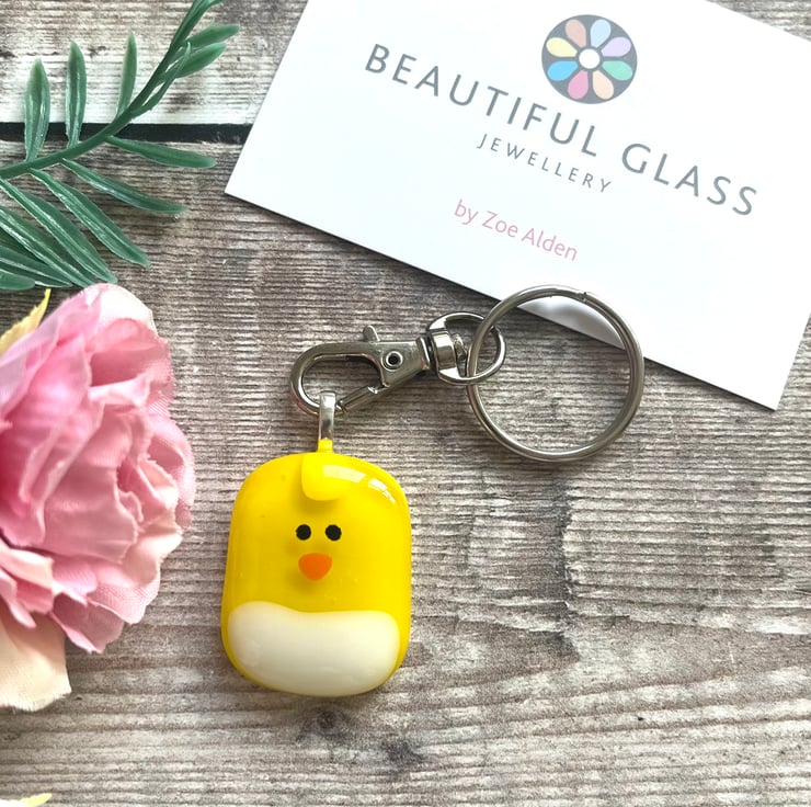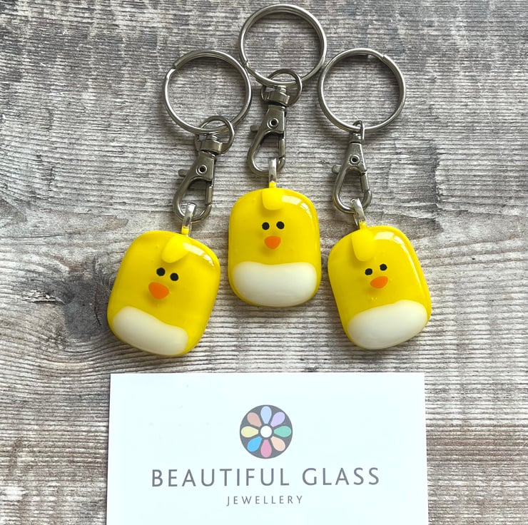 Individually handmade by fusing tiny pieces of yellow, white and orange glass together, so each chick is unique and may differ slightly from the photo. It comes on a split ring with a keyring trigger.