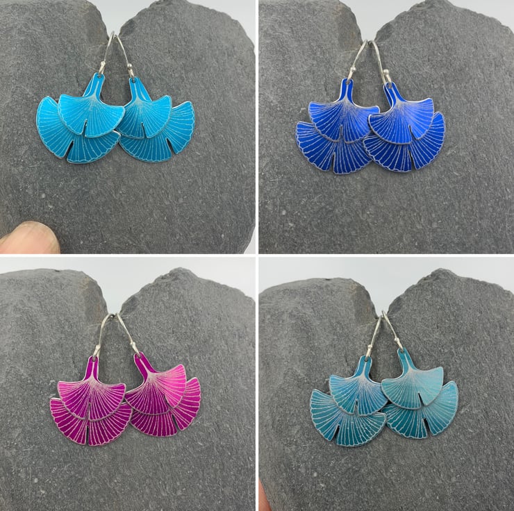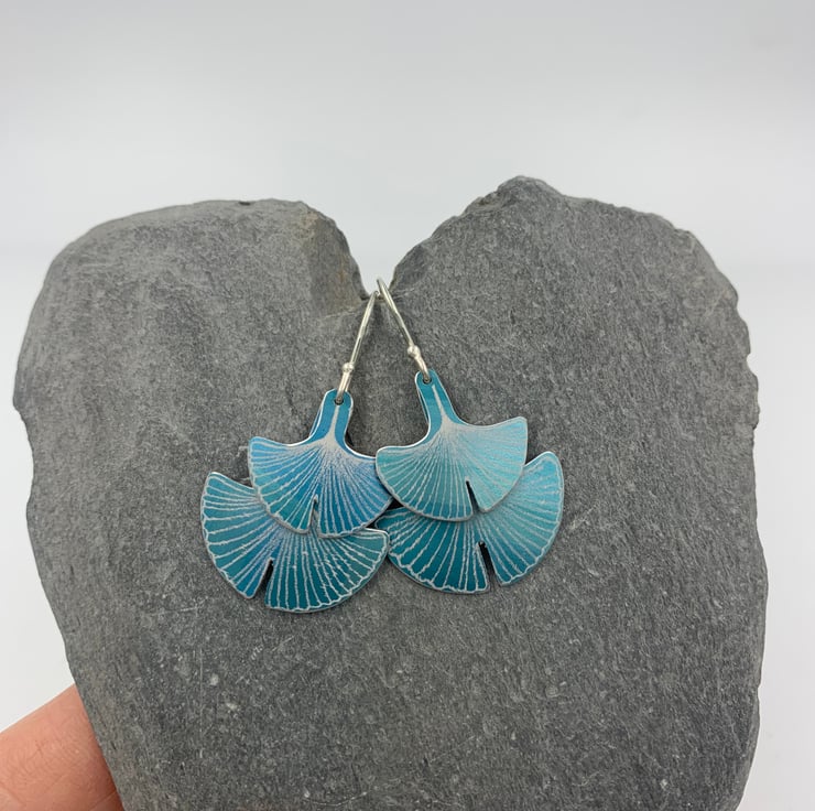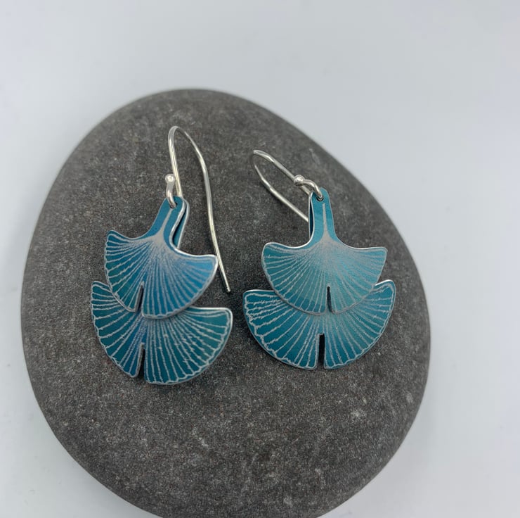 Not one, but two ginkgo leaves! The hand drawn ginkgo design has been laser etched onto aluminium. The earrings have been dyed teal and they hang from handmade sterling silver ear hooks.