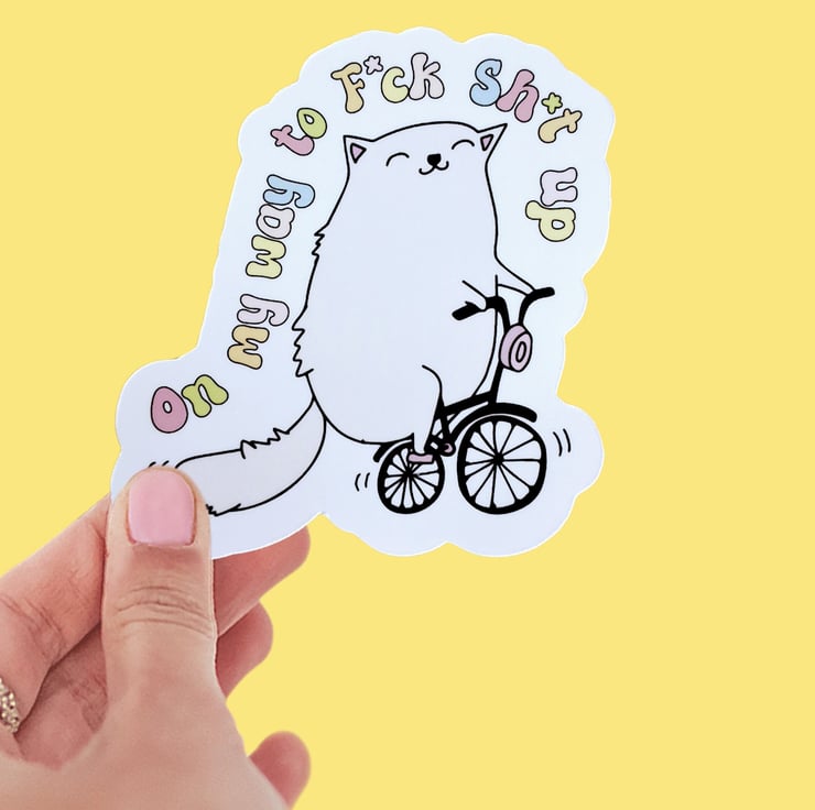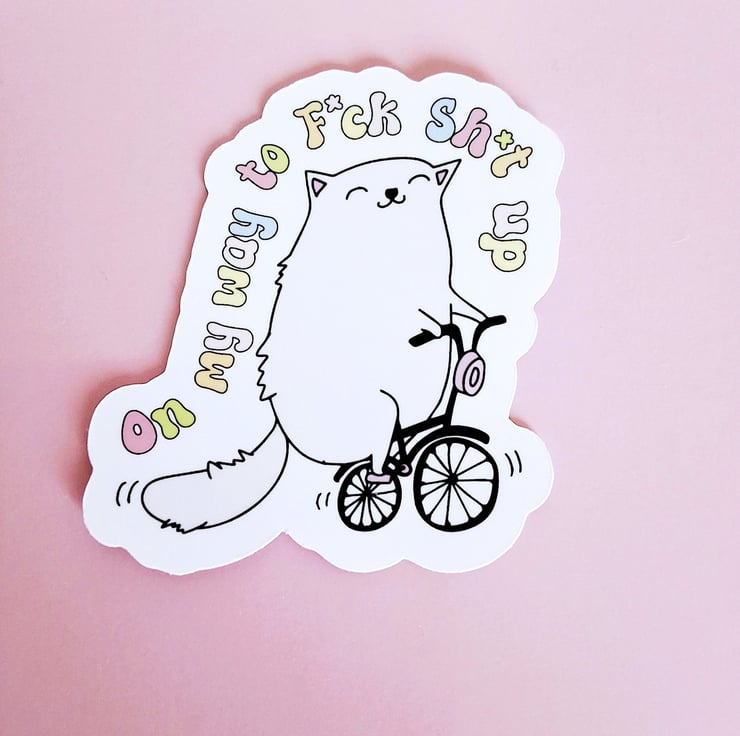 This Waterproof Funny Adult Sticker features a bold statement that is sure to bring a smile to your face. With a quirky design of a cat on a bike, this sticker is perfect for adding some personality to your work or personal space.
