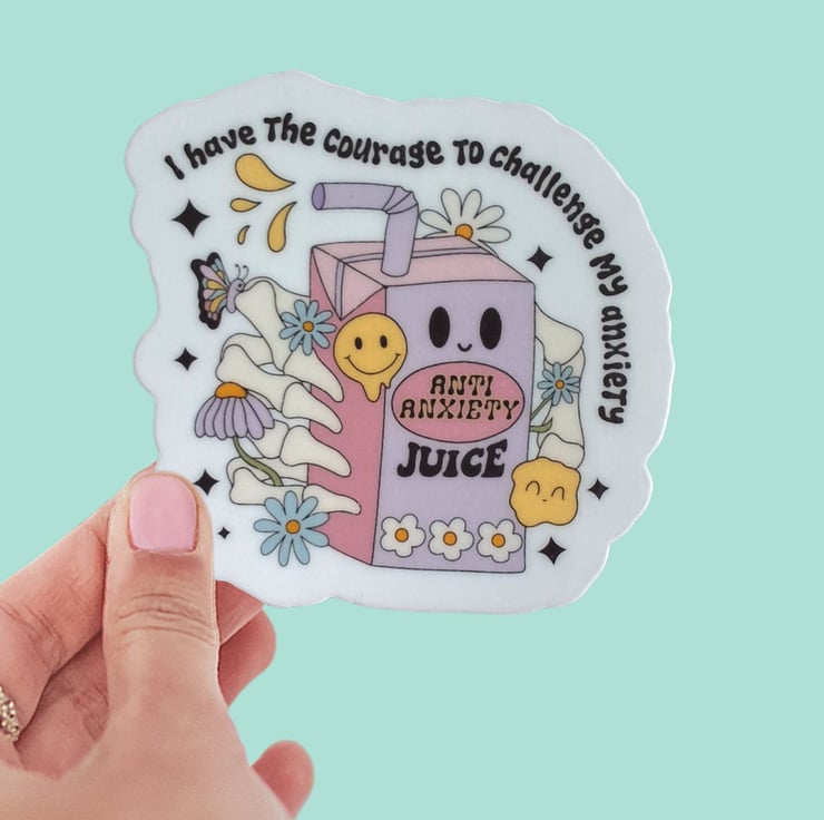 Anti Anxiety Juice: The design features a playful juice box with a calming message to help ease anxiety " I have the courage to challenge my anxiety"