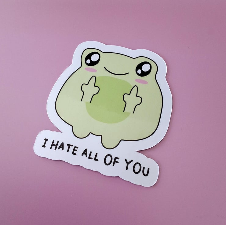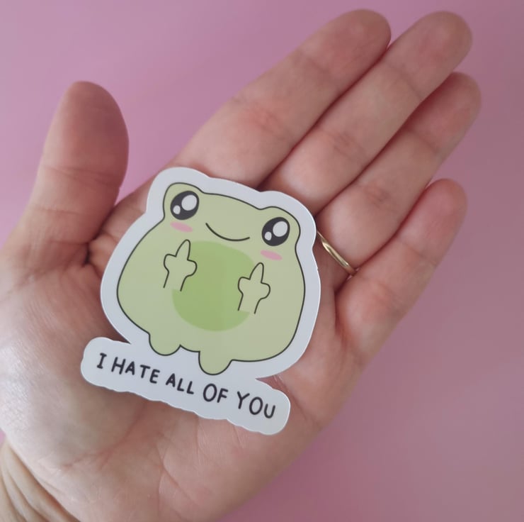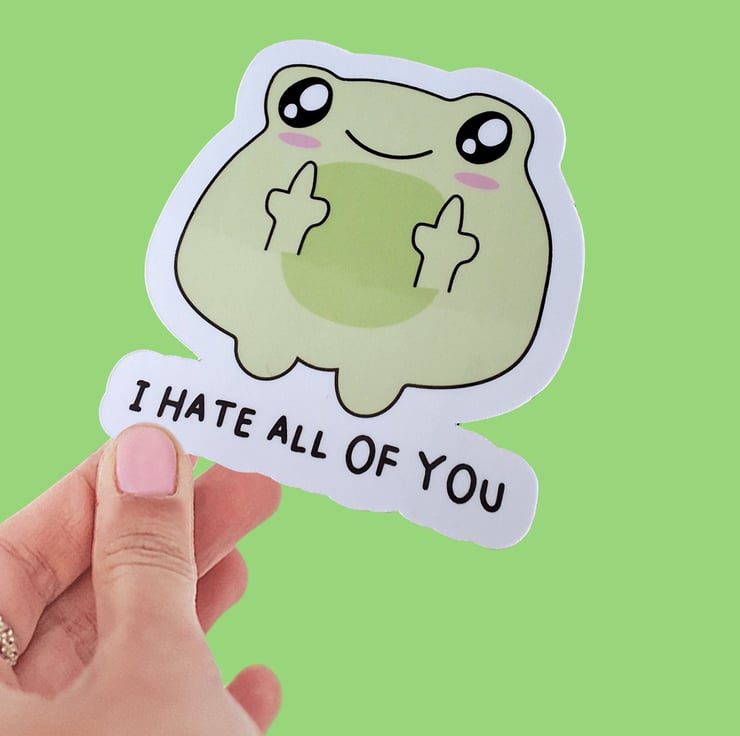 This Cute Rude Frog Sticker will add some humour and personality to any surface. The sticker features a cartoon frog sticking out its middle fingers. It is made of waterproof material, so it can withstand the elements, making it perfect for outdoor use.