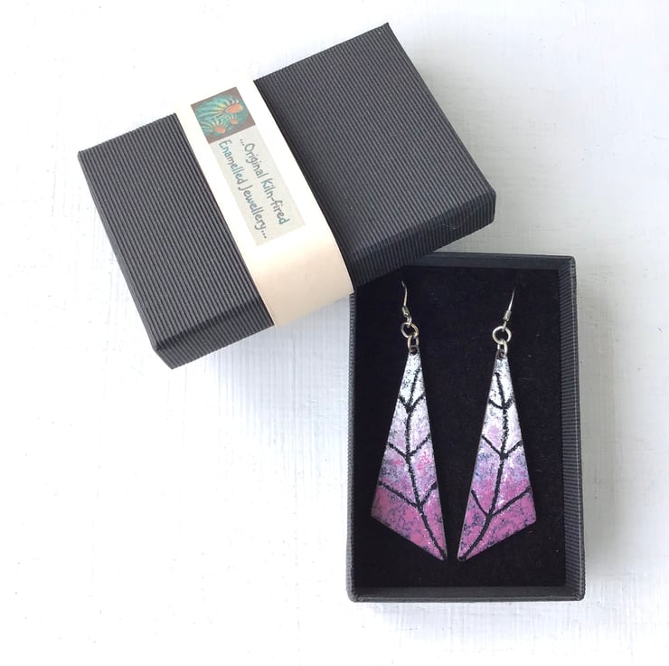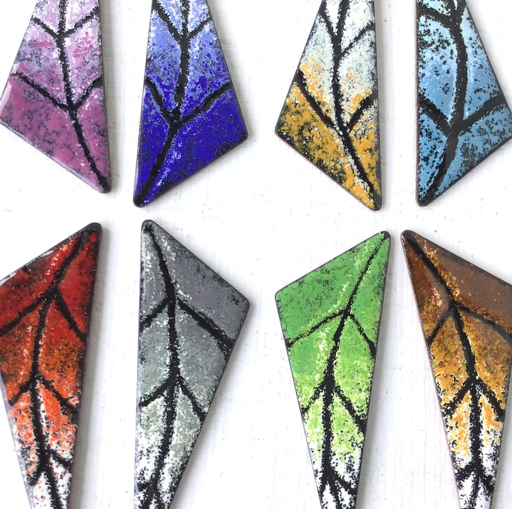 My Long Triangle Enamelled Earrings - Leaf Vein Effect are made with a copper base and decorated with a black leaf vein pattern in a range of shaded colours. Several layers of enamel are needed with firings in between to complete the earrings. The leaf veins are hand drawn through the final coloured layer to reveal the black underneath. The reverse is also enamelled to add strength and durability.