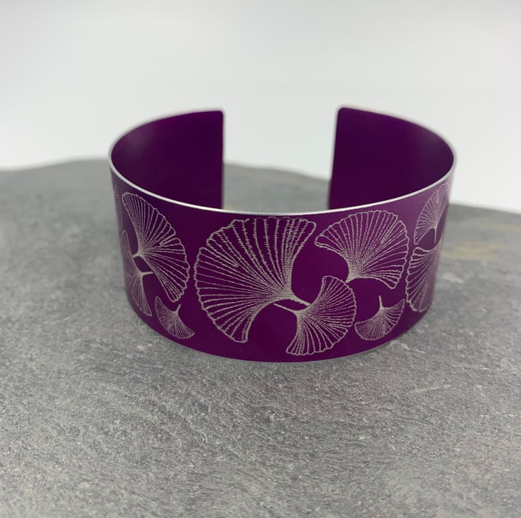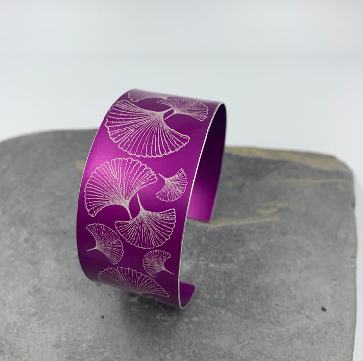 Jazz up your summer wardrobe with this statement ginkgo leaf cuff! Made from lightweight anodised aluminium which has been laser etched with a hand drawn ginkgo leaf design, and dyed dark pink/purple. It measures approx 3cm across.
