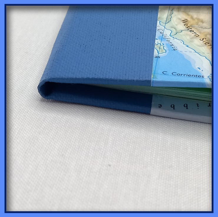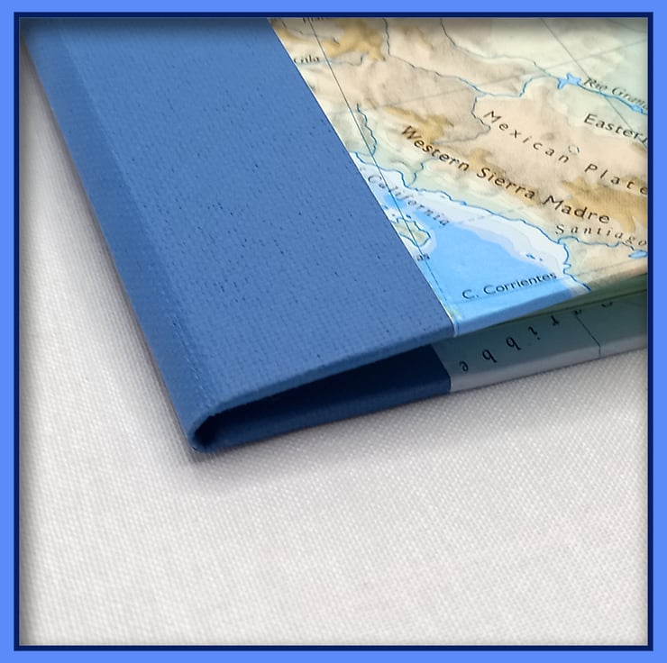 The hard casing is cover a as Quater Bound design, using light blue bookcloth for the spine with a map of United States of America for the frone and back covers, from an old atlas