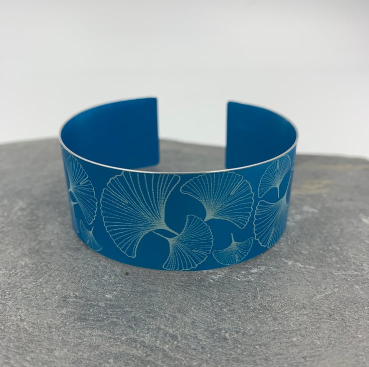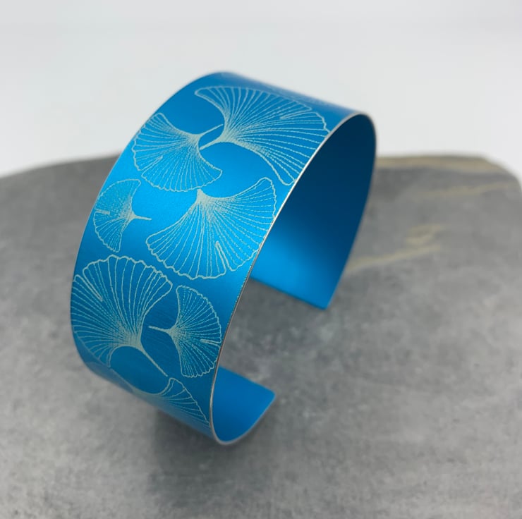Beautiful turquoise statement cuff etched with a ginkgo design. Lightweight and so easy to wear. I drew the original ginkgo design then transferred it to a laser etching machine which copied the design onto hand dyed anodised aluminium.