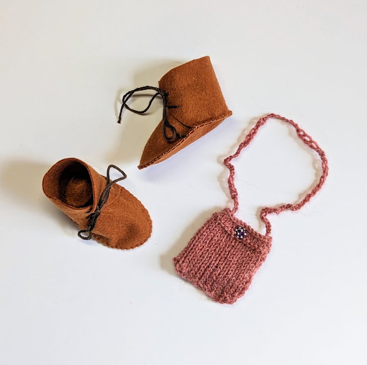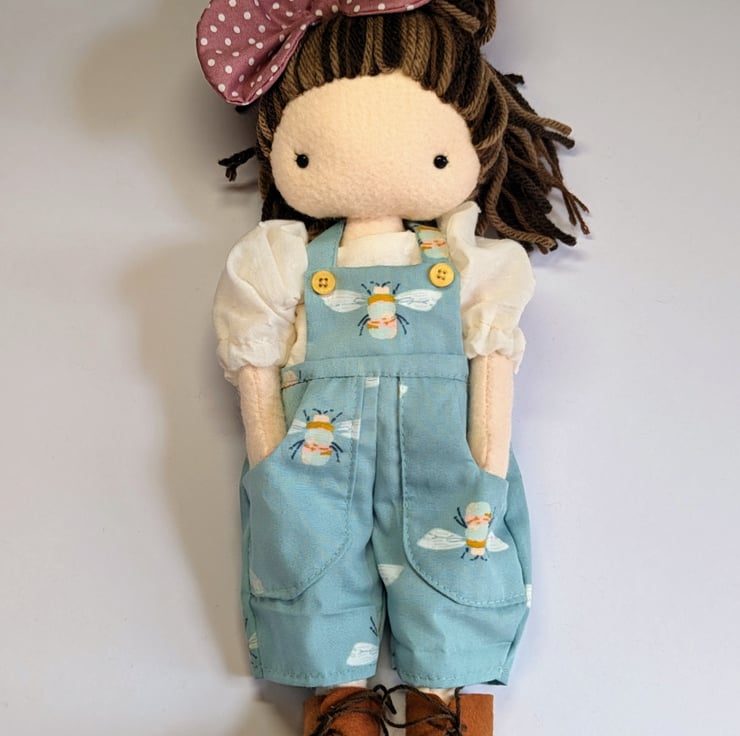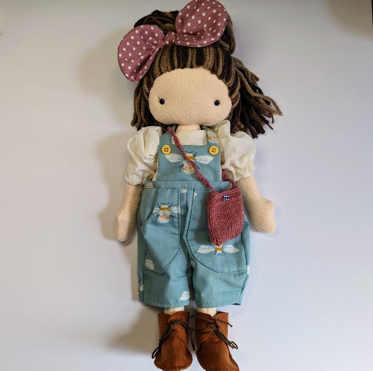 She is a unique handmade felt dolly, wearing a beautiful hand-sewn blouse and gorgeous bee-patterned dungarees. Her yarn hair is fastened in a messy bun with an oversized, handmade bow. Her outfit is completed with little felt boots and her hand-knitted bag as a finishing touch.