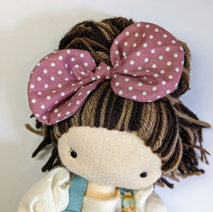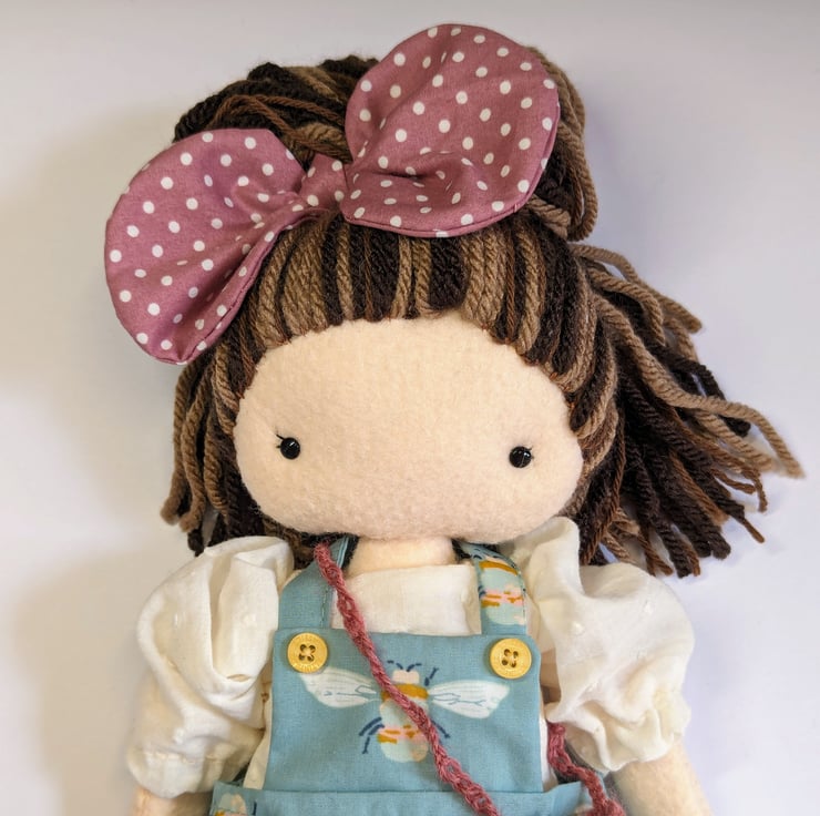 I was inspired to make Melissa by the bee fabric I used for her dungarees! I have had it for ages and was waiting for the perfect project to use it. The sun has started to shine here in North Wales and the bees are on the lavender in the garden. Seeing them reminded me of this fabric I had in my stash and I realised it would make amazing dungarees! I also wanted to try a different method of doing this doll's hair, so that led to the creation of the messy bun and the gorgeous bow! I am very pleased with how Melissa turned out, I hope you love her too xx
