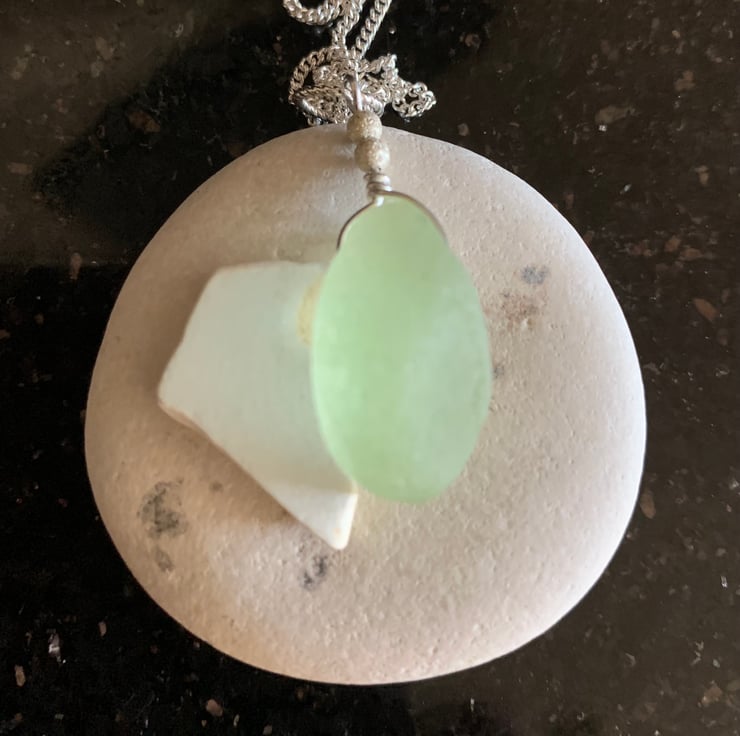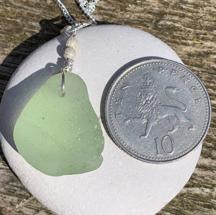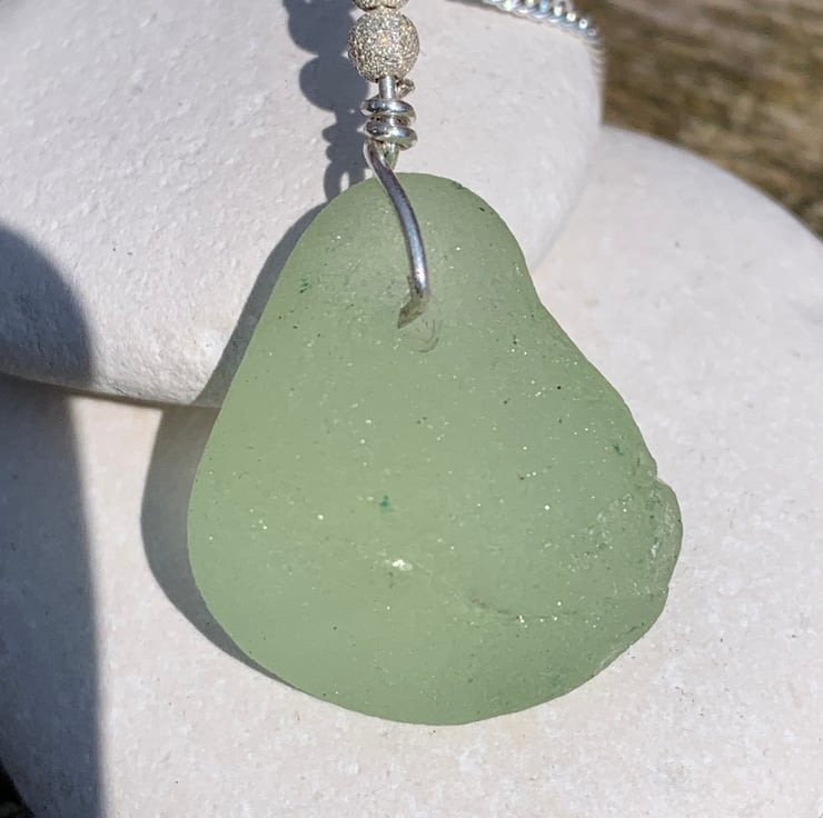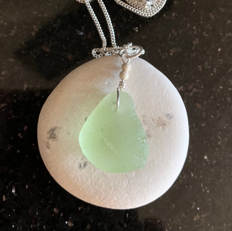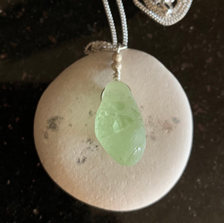 A very unusual pale green chunky piece of seaglass is top drilled and attached by a hand crafted mount, which includes 2 Sterling silver sparkly beads, to a 22in Sterling silver chain. The seaglass is roughly triangular in shape with 2cm sides and varies in thickness with approx 1.3cm at its thickest. Some chips in the surface of the seaglass allow the inside of the glass to be seen. Markings from the item that this seaglass has come from can also be seen. Photos taken from each side of the piece are shown to give an idea of its thickness.