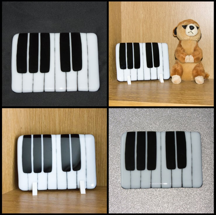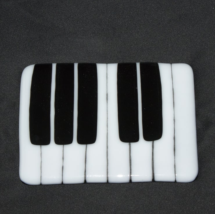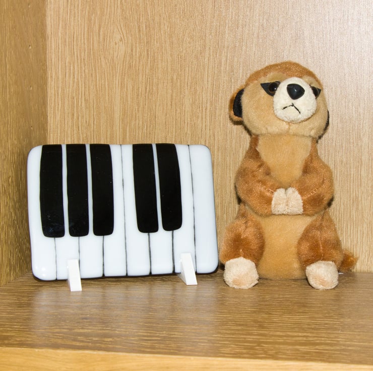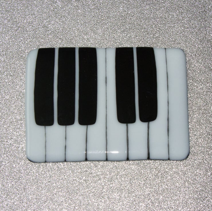 This plaque will serve as a decorative piece, or as a coaster to protect your furniture. It is approximately 14cm long and 10 cm tall. It features 8 white keys and 5 black keys. It has 4 little rubber feet on its base to prevent it from slipping around.