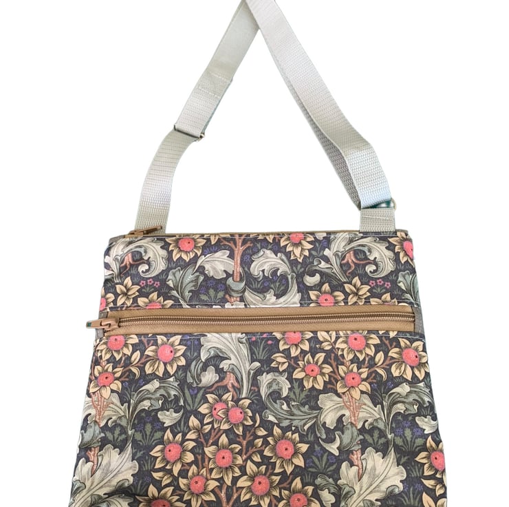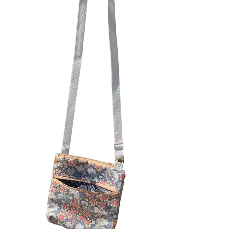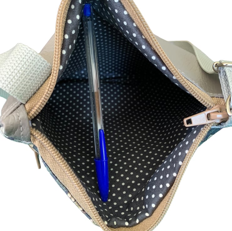 Beautiful slim crossbody bag with 2 zip pockets made from water resistant and vegan friendly faux leather. The lining fabric is 100% cotton.