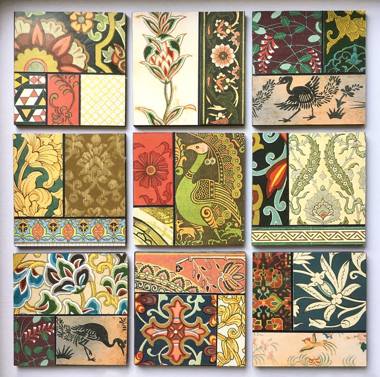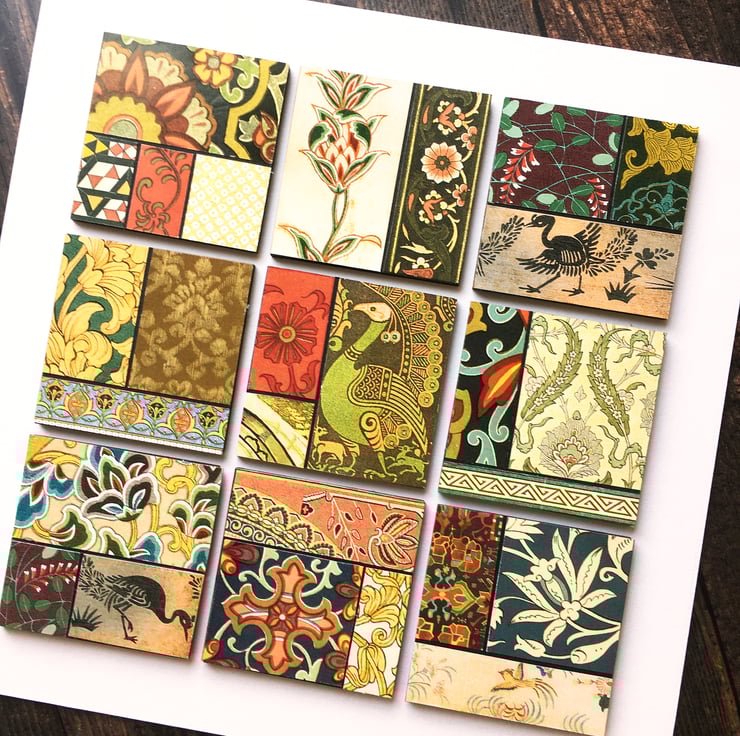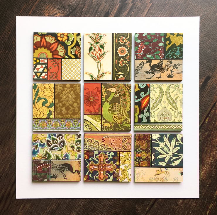 An original piece of art made using decorative papers from old books. I have made nine mini collages using papers in muted tones to give the feeling of vintage tiles. Each mini collage has been mounted onto black paper, leaving fine black lines between the pieces. They have then been mounted onto mdf squares and presented in a shadow box frame.