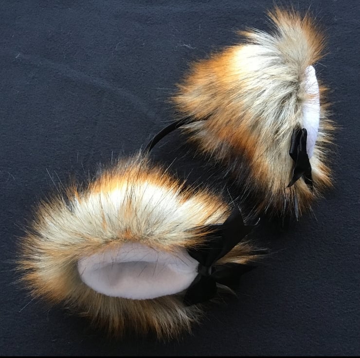 Matching red fox ears , with white inners, and black bows, that are attached to a black headband.