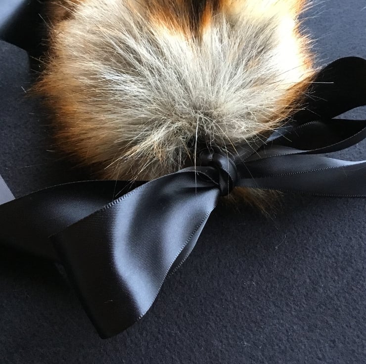 Comprising of a 25-26 inch long luxurious red fox tail with a white tip, and a Elasticated loop sewn onto the tail, for the black satin ribbon to thread through, and this enables the tail be tied around the waist, or threaded through a loop.
