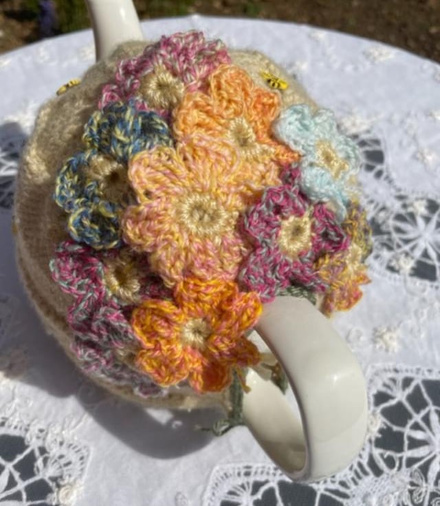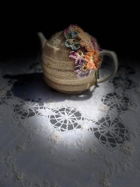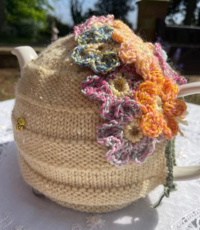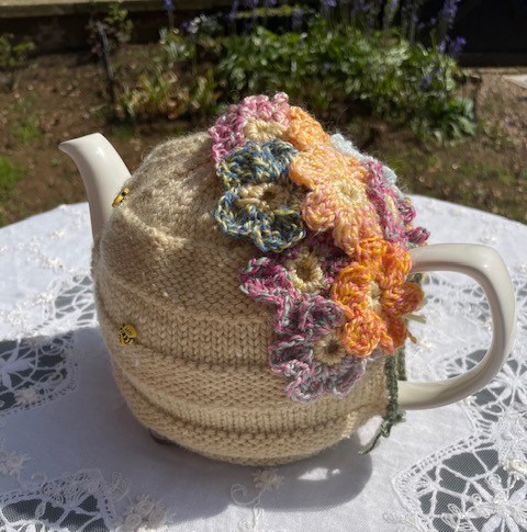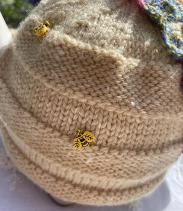 The undyed natural Seasalt yarn has a subtle slub effect and is an easy yarn to work with for dyeing and knitting. I am a beekeeper and love all things honey & bee related and the old fashioned woven skeps used by beekeeping monks of old have always looked so beautiful even if we don't actually use them anymore and is the perfect teapot shape.