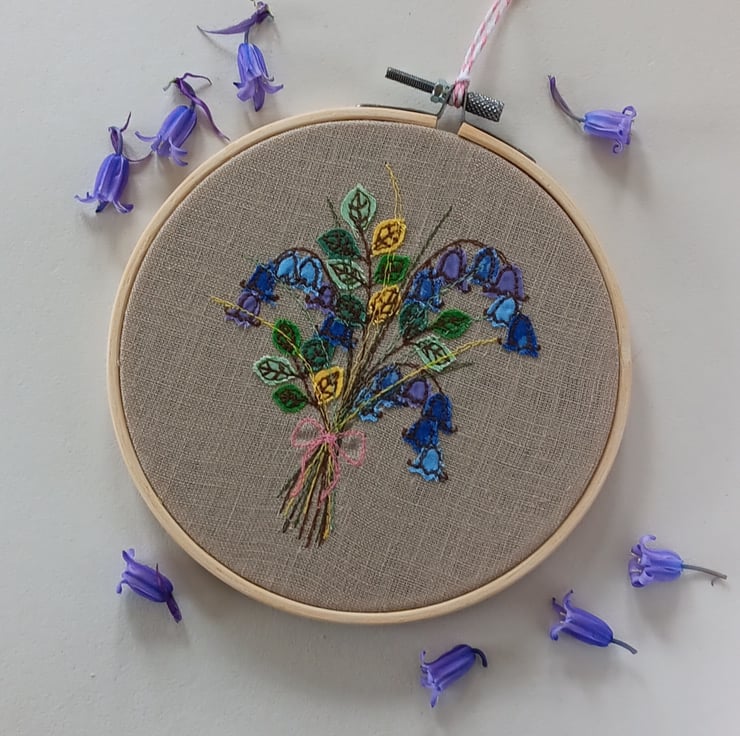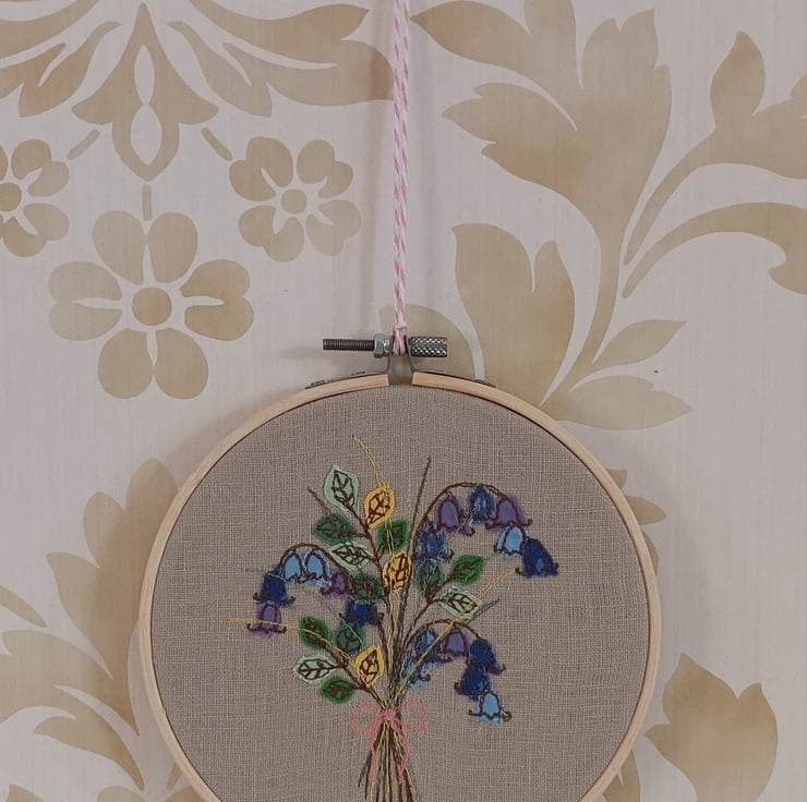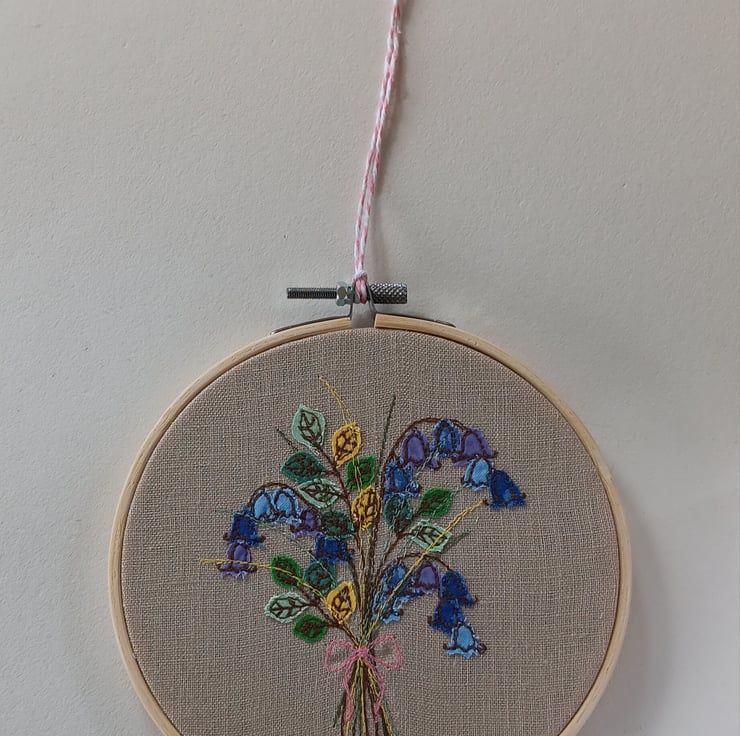Beautiful spring embroidery, perfect for hanging just about anywhere, from a bedroom to a living room, a summer house or a hallway. This would also make a perfect house warming gift. The design is made by cutting out by hand some teeny tiny pieces of fabric to make the leaves and bluebell flowers. They are then stitched on to a lovely beige linen using free motion embroidery. A few sprigs of grass are added in different coloured threads along with a pink bow. The back is neatly covered with white felt and there is a pink and white stripe string to hang it. The embroidery hoop measures approximately 15cm.