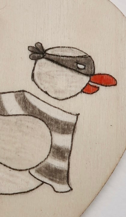 This fun cartoon decoration is a handdrawn one-off item and measures 10x10cm with an upcycled string loop of approximately 9cm. A magnet can be added if preferred.