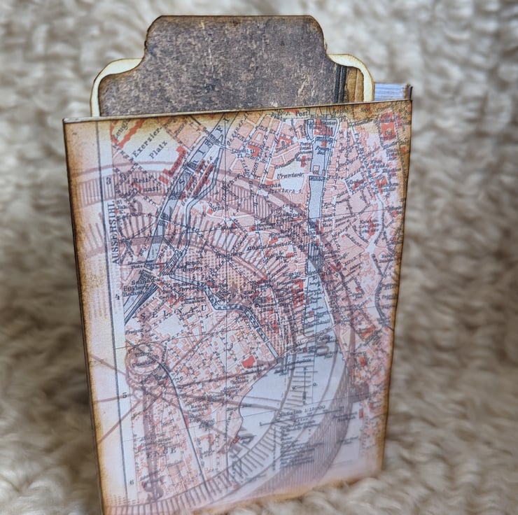 4 1/2 x 3 1/2 x 3/4 inch journal covered with map card stock, edged heavily with pigment ink