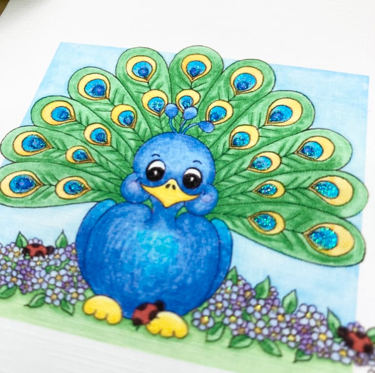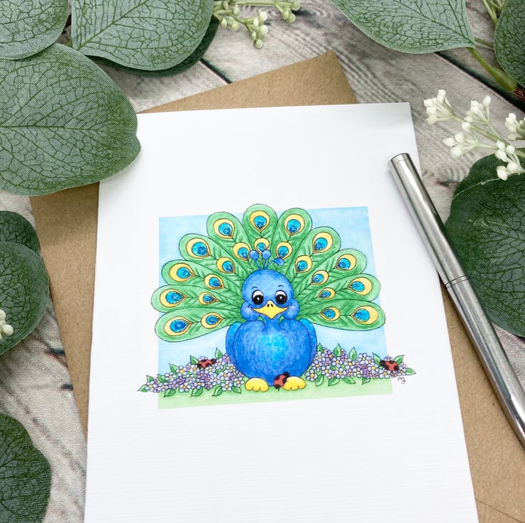 This cute Peacock card has been designed using my own original watercolour illustration. The card has been printed out onto good quality linen embossed card and hand finished with a little glitter detail.