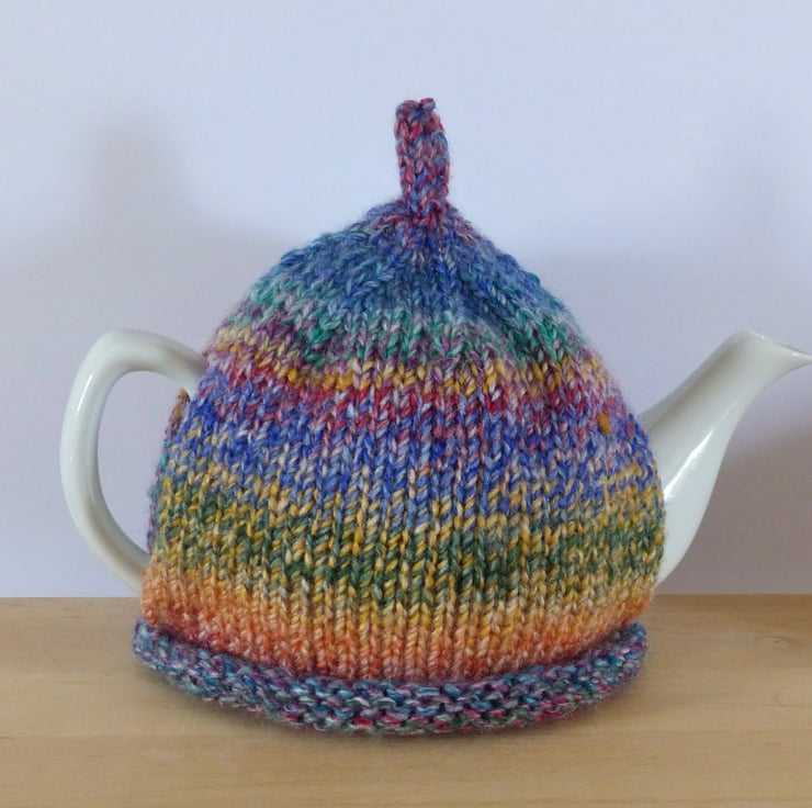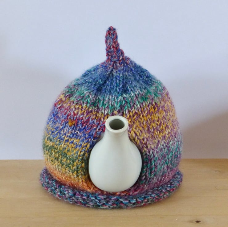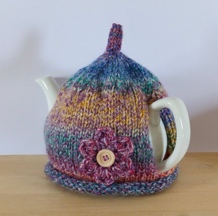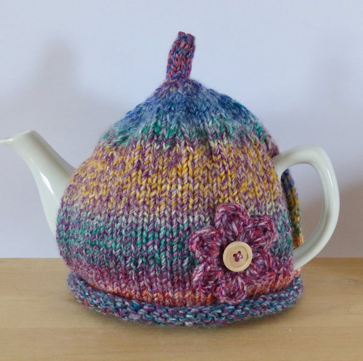 A hand knitted Tea Cosy in a colourful chunky variegated yarn - Purple, Blue, Green, Red, Orange etc. It has a 'pixie' top and a crocheted flower, in the same yarn as the cosy, on the front for decoration. This has a natural wood button in the centre.