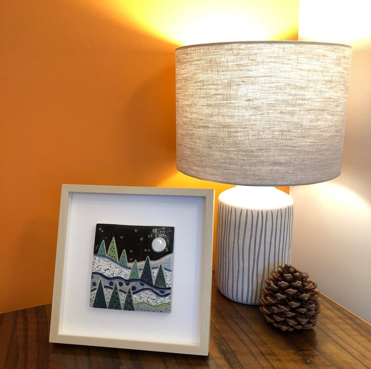 After rolling a slab of stoneware clay I have carved into the tile to trace shapes for the landscape and fir trees. After biscuit firing I have used a range of coloured underglazes to recreate the magic of a wintery landscape complete with full moon and stars.