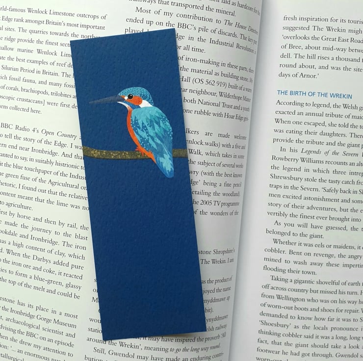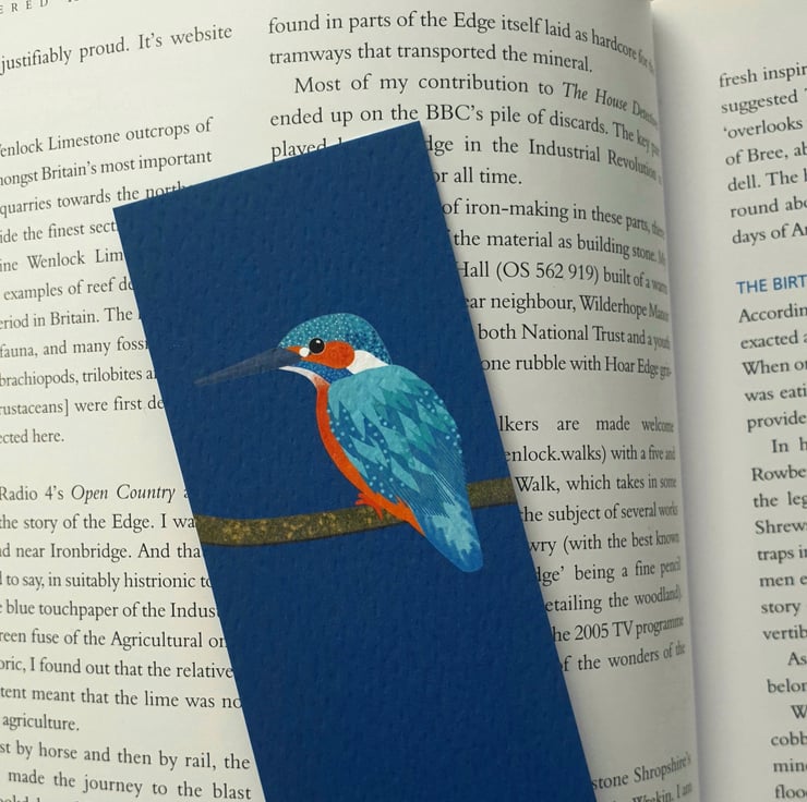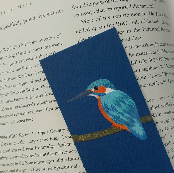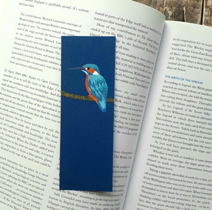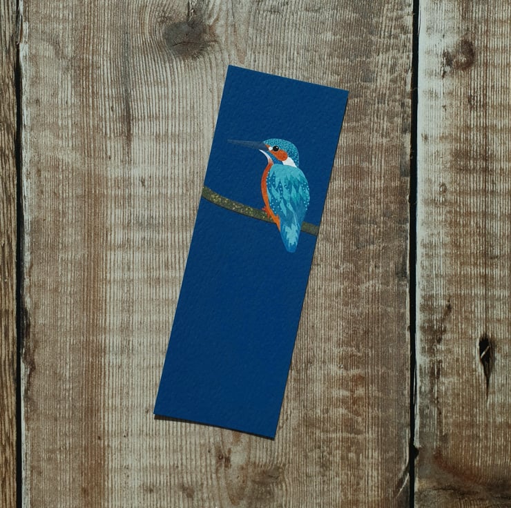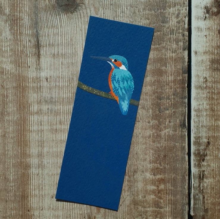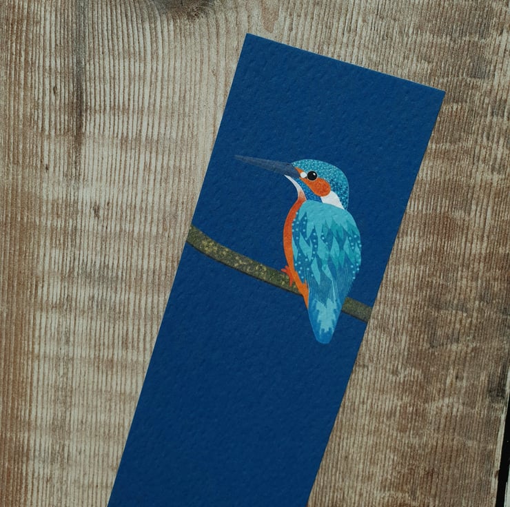 My kingfisher on a branch illustration professionally printed in the UK on a beautiful hammered fresco gesso 300gsm card and made into a bookmark