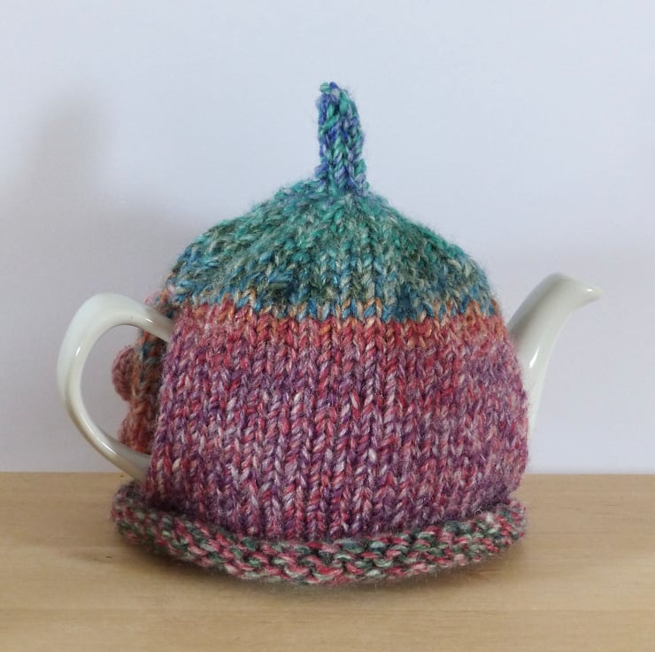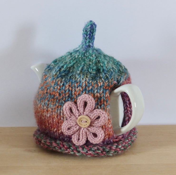 A hand knitted Tea Cosy in a bright variegated chunky yarn, Purple, Red, Green, Blue, Orange etc. It has a 'pixie' top and a french knitted flower in Dusky Pink on the from for decoration. The flower has a small wooden button with the words 'Handmade With Love' in the centre