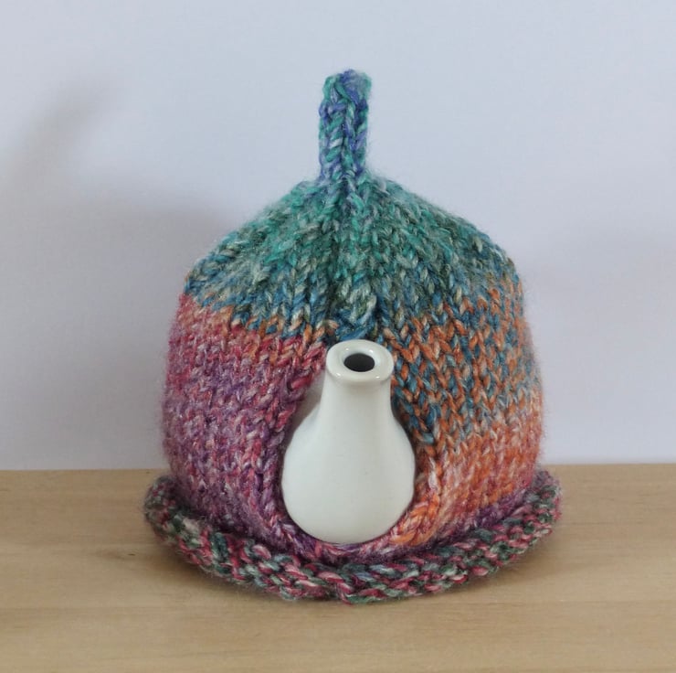 Knitted to fit a standard Two Cup teapot this cosy has a roll rim and plenty of stretch so should fit a variety of small pots.
