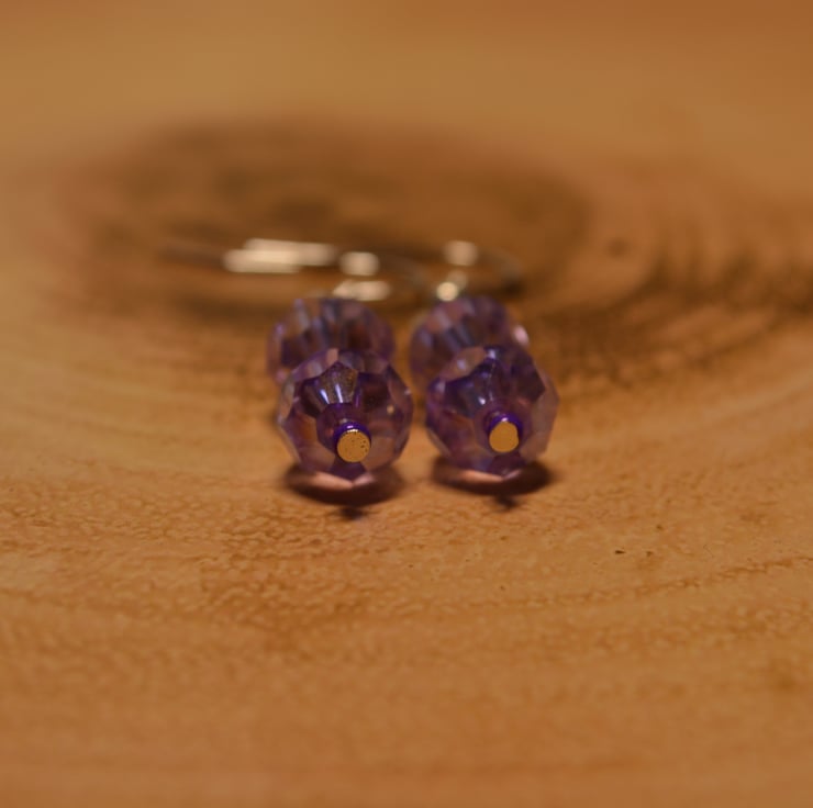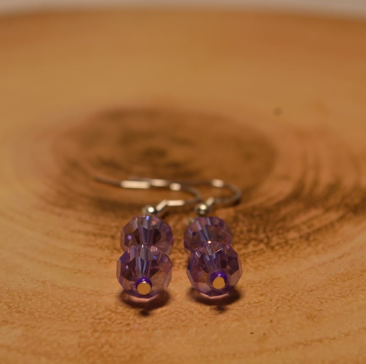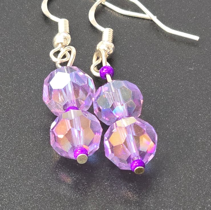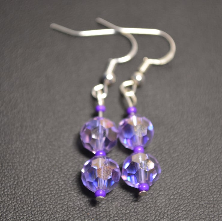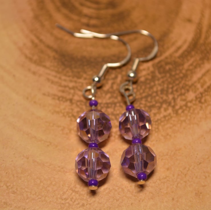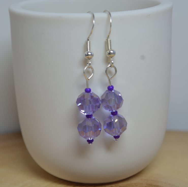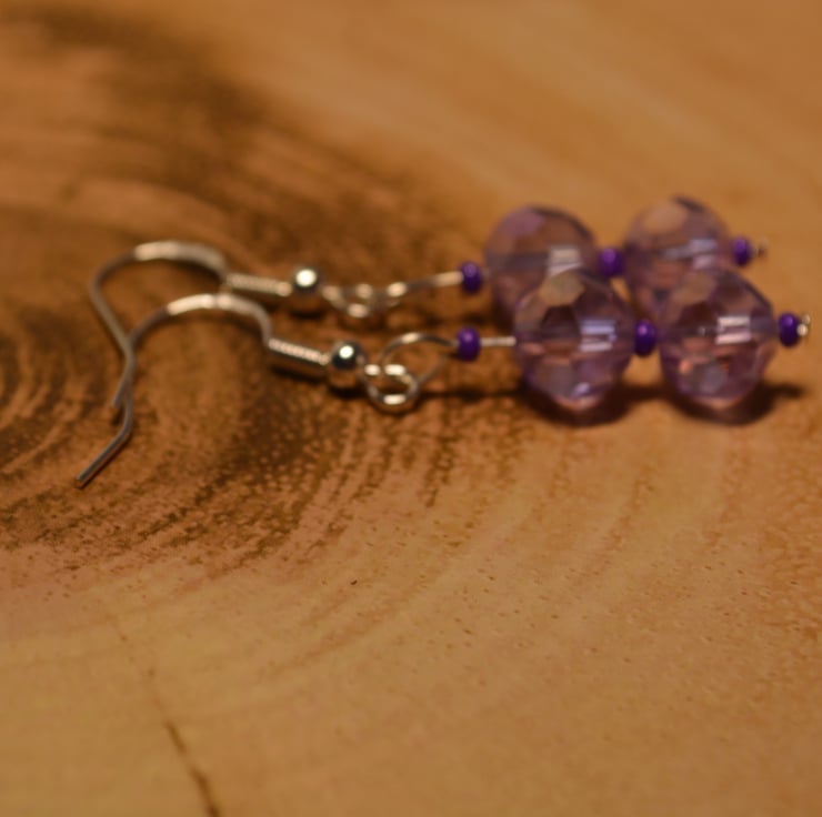 The earrings have been made using a lovely combination of light and dark glass beads. I've used 2 light purple faceted glass beads with small dark purple matt seed beads above and below each bead. The hooks are silver 925 and hypoallrgenic. The earrings can be changed to clip-on if required.