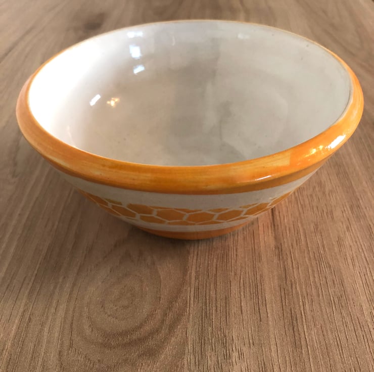 I threw this bowl from white clay in my home studio After biscuit firing I used underglaze, stencils and masking tape to create the flowing honeycomb design. The white glaze on the internal surface is perfect to show off food of your choice. I'd go for greek yoghurt, granola, fruit and a drizzle of honey! How about you?