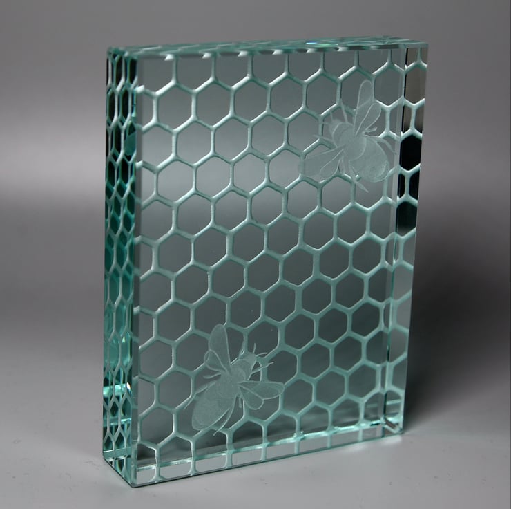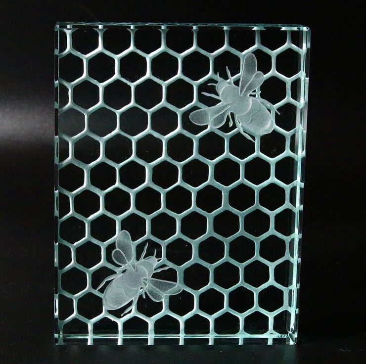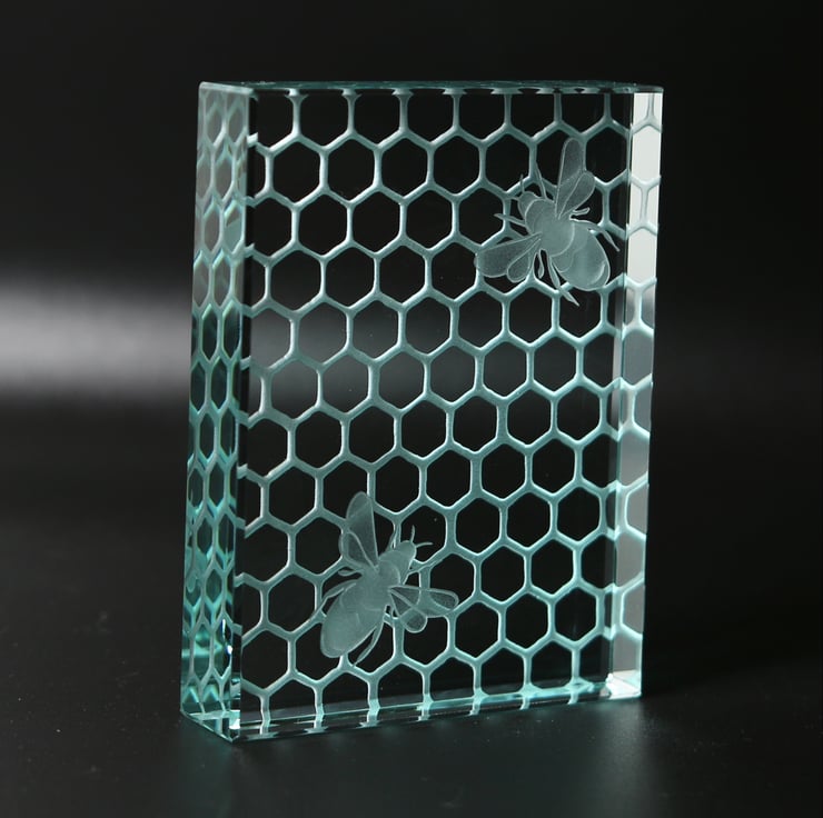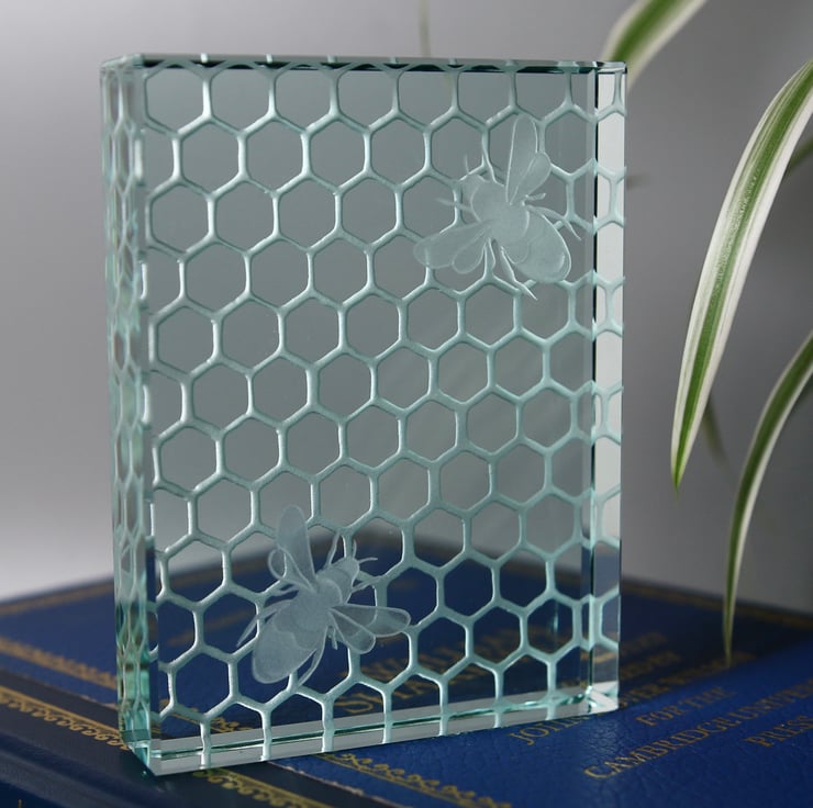 This is an original design of bees on a honeycomb using both sides of the glass to create a stunning piece of art that will look wonderful wherever it is placed. The honeycomb on the back of the block is deeply sandblasted to give a lovely tactile experience when you hold it and the depth of the design pulls the light into the glass to make it glow. The two bees busy working on the front of the block are subtly shaded to give a beautiful three dimensional effect against the honeycomb.