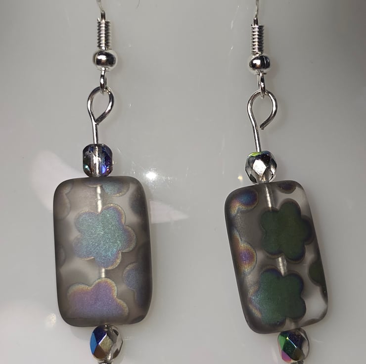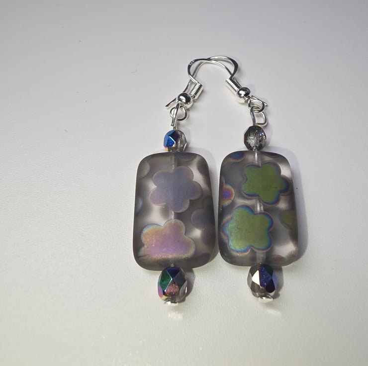 The earrings have been made using clear matt Peacock rectangular pressed czech glass beads with clear crystal fire polished beads above and below. The beads all have a lovely show of different colours and have a fantastic sparkle in the sunlight.