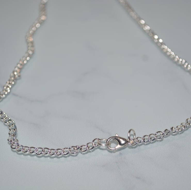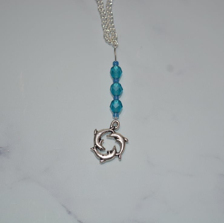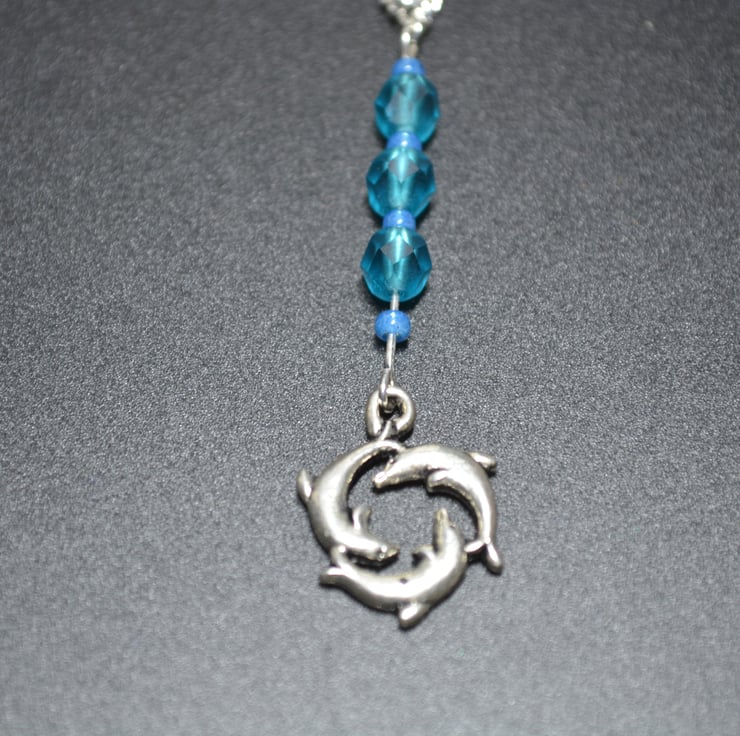 The necklace is a silver chain which is 19 inches in length and coming down from the centre is 3 teal fire polished beads with small matt blue seed beads in between with a metal silver dolphin charm that hangs off the bottom. I picked colours that compliment each other and looked like the ocean. The Dolphin charm is 21x17mm and is 3 Dolphins in a circle.