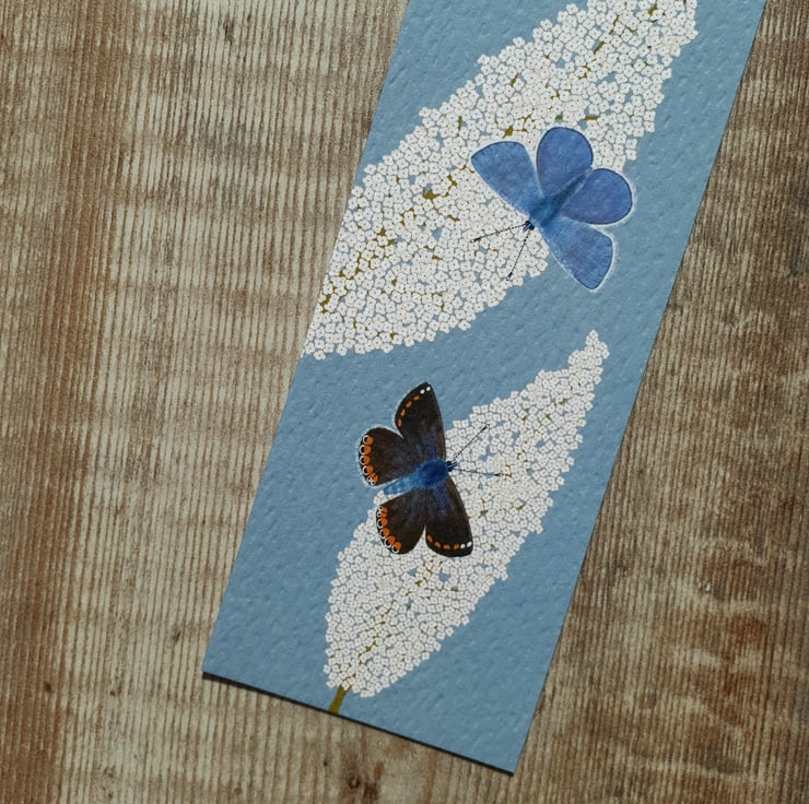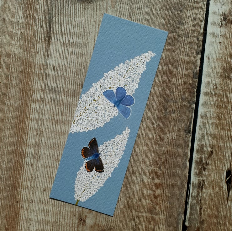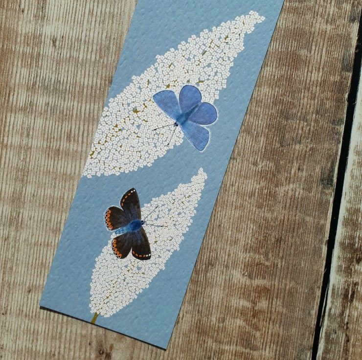 My common blue butterfly and buddleia illustration has been professionally printed in the UK on a beautiful hammered fresco gesso 300gsm card and made into a bookmark.