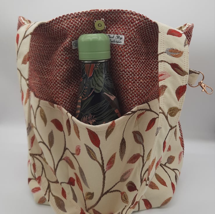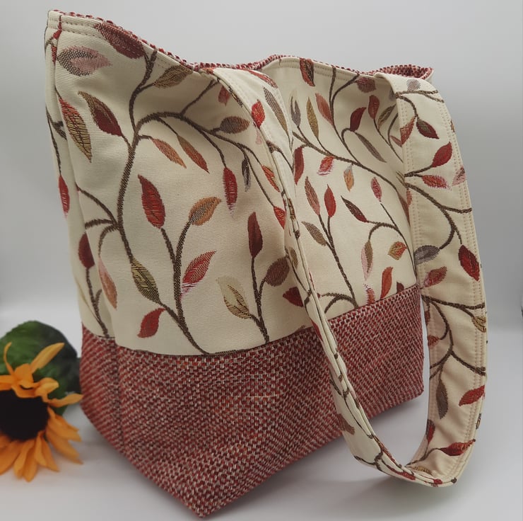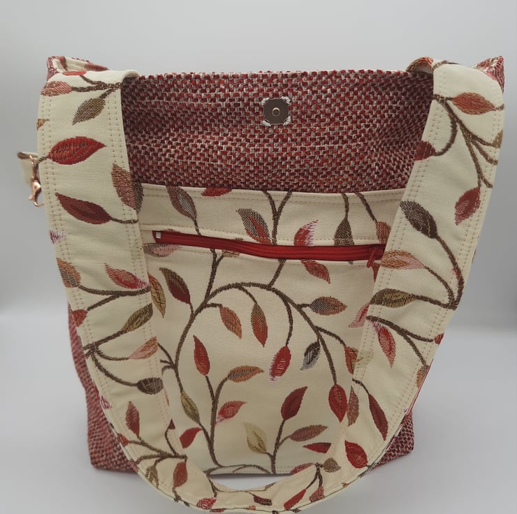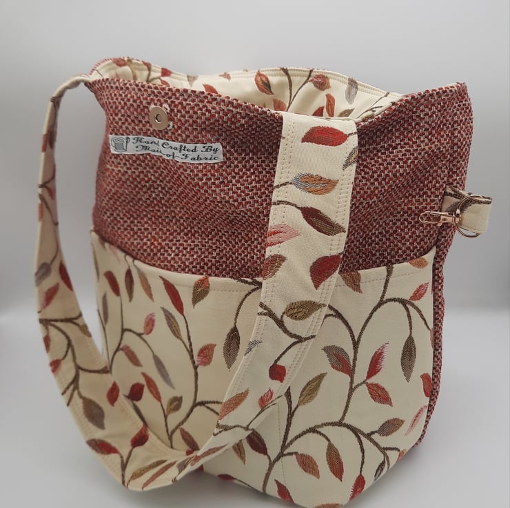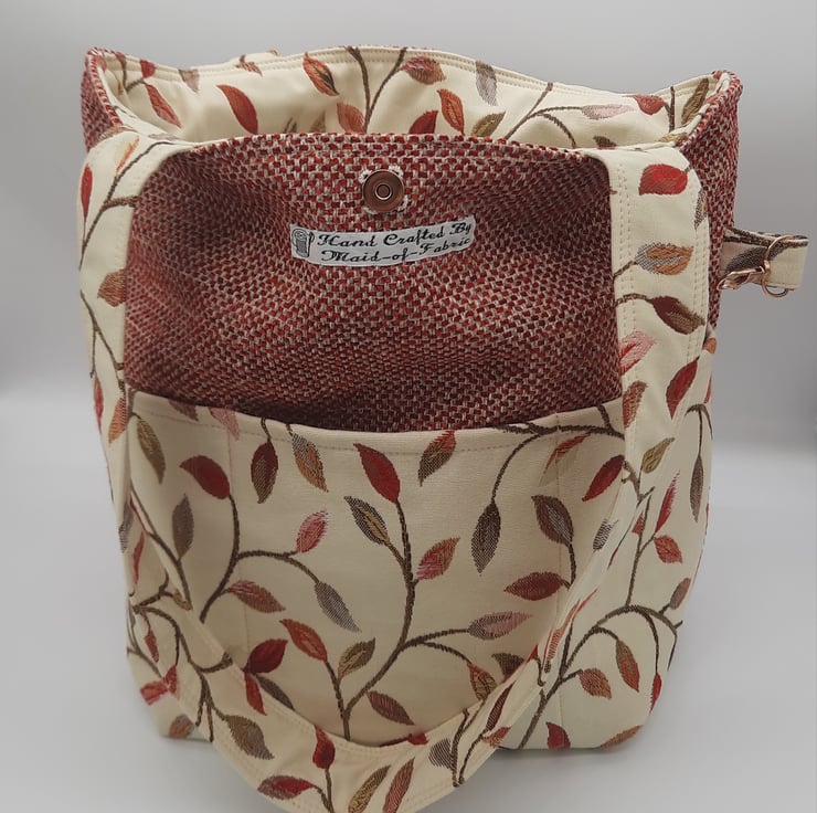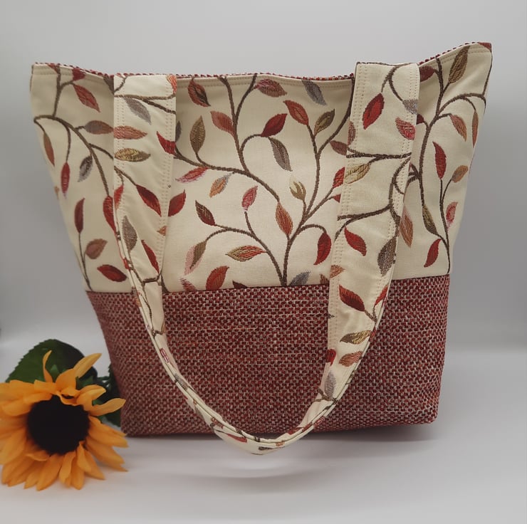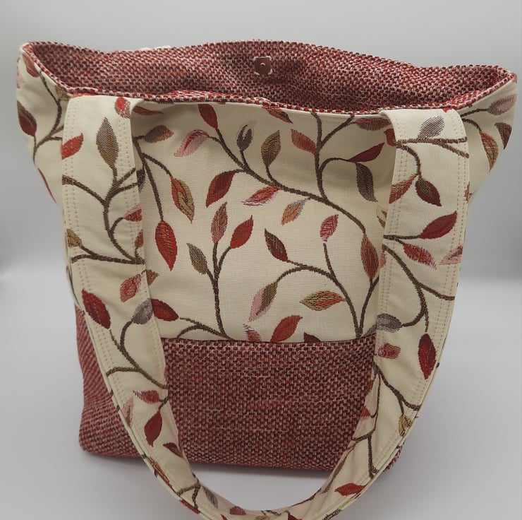 This tote bag has been made using a cream leaf embroidered fabric and a red and beige fleck soft touch fabric.
