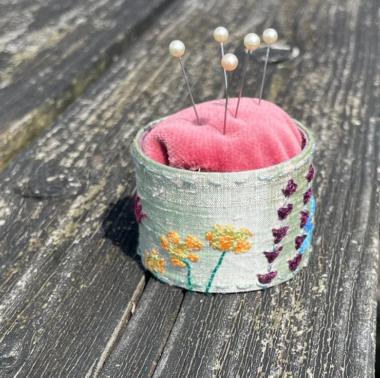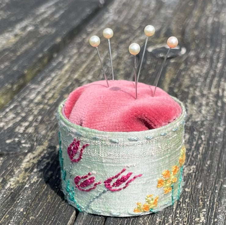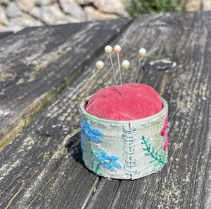 Pretty handmade pin cushion incorporating a hand embroidered floral swatch.