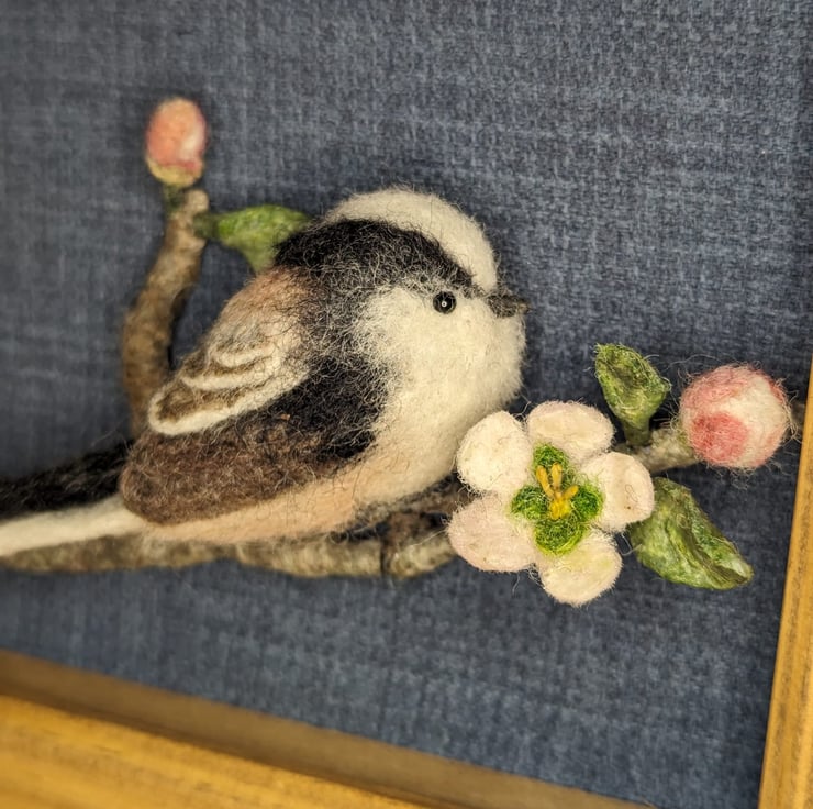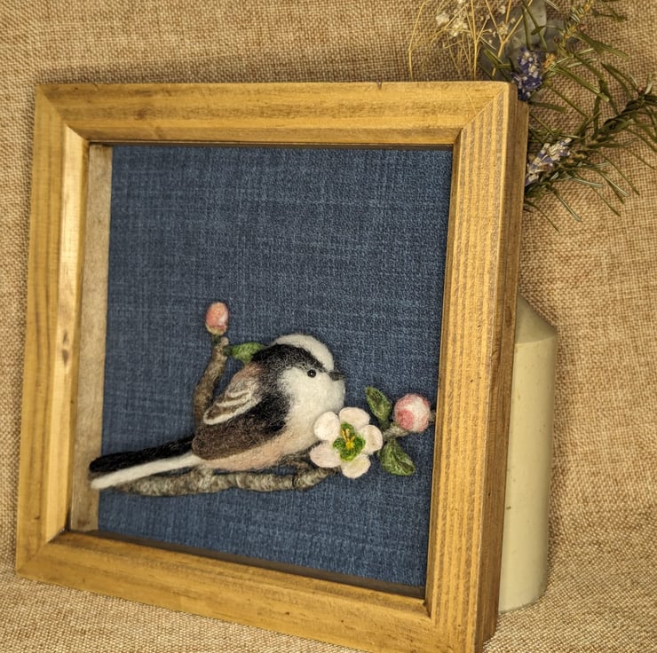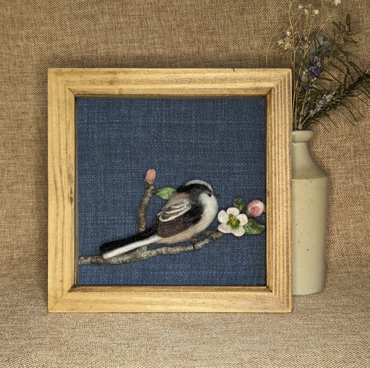 This one of a kind needle felted Long Tailed Tit is perched upon an apple tree branch with blossom. The bird is displayed in a wood stained box frame (18cm x 18cm) and backed with a dark blue linen.