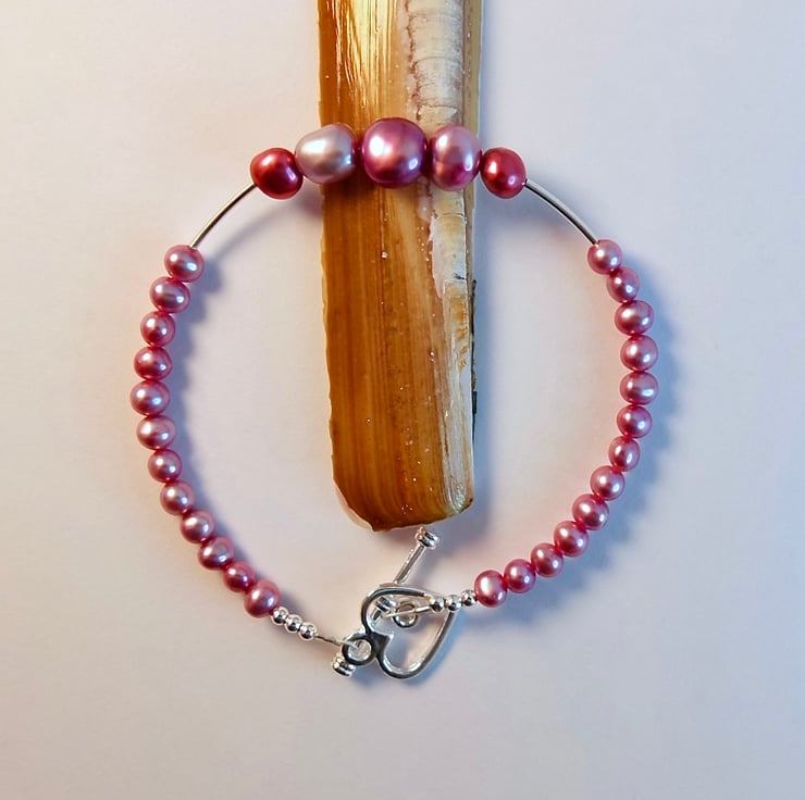 The circle is completed with 4mm Freshwater potato Pearls, trios of 2mm sterling silver spacer beads, and a pretty silver plated heart toggle clasp.