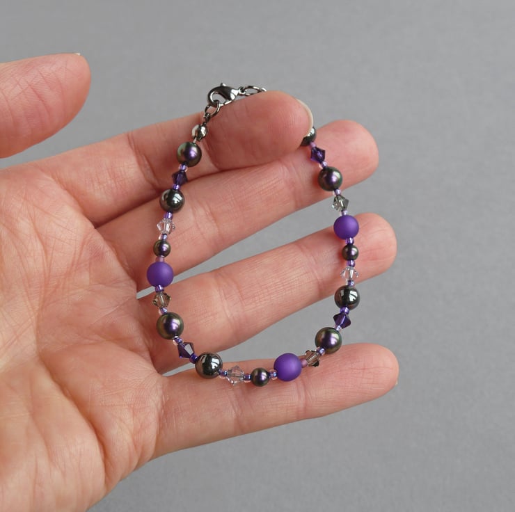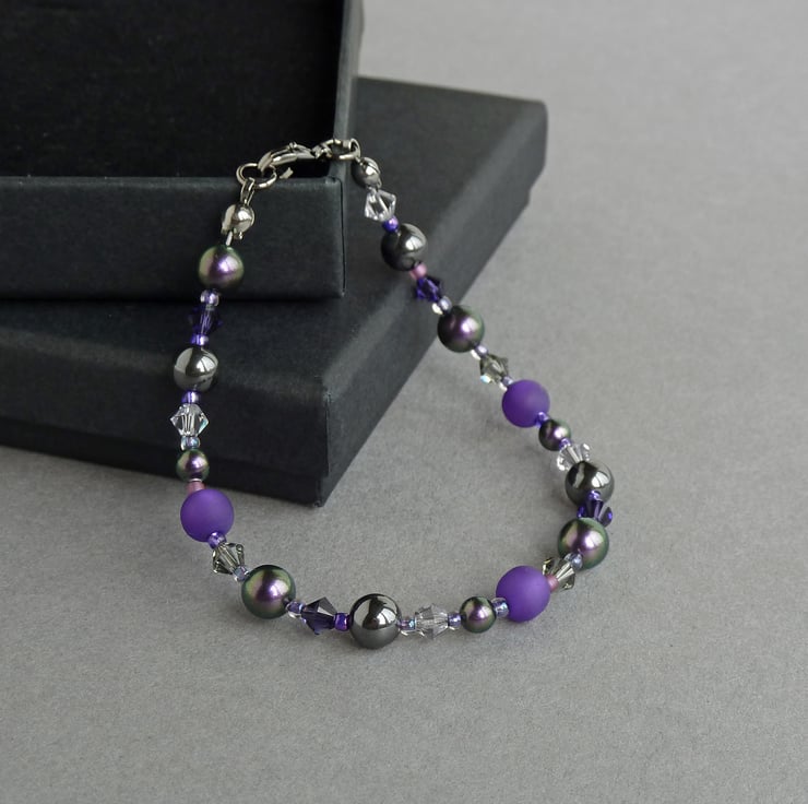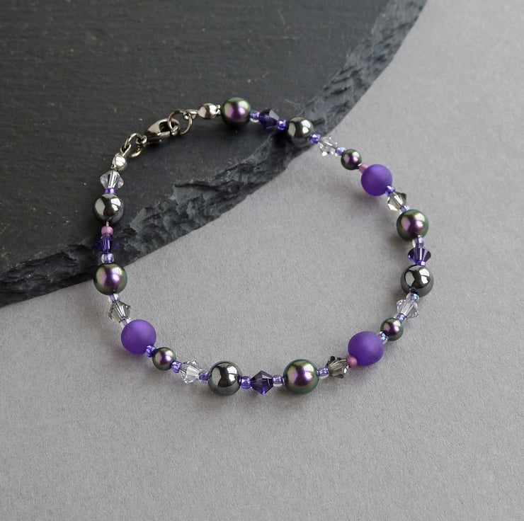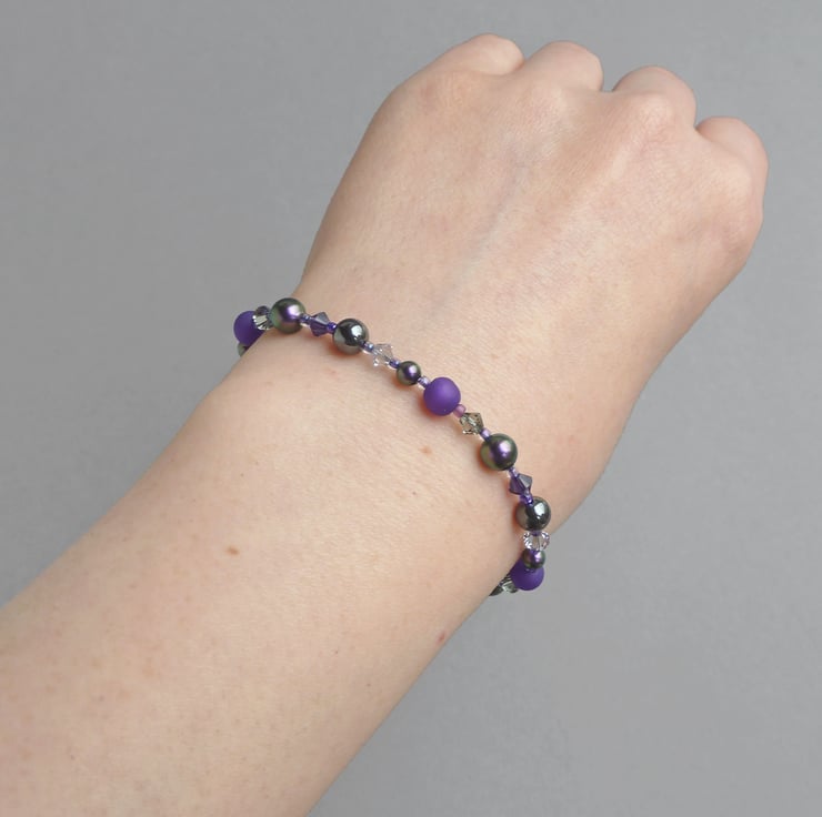 This royal purple beaded bracelet teams the lustre of glass pearls, the sparkle of crystals and the sheen of hematite to create a sparkly, colourful bracelet. This royal purple bracelet has the versatility to be worn everyday and be dressed up for more formal occasions.