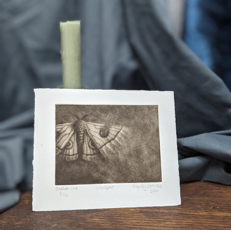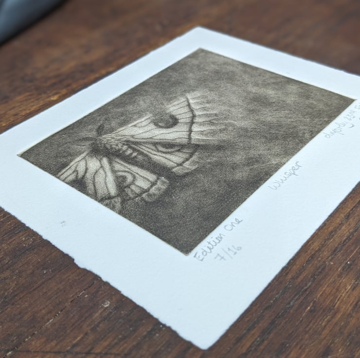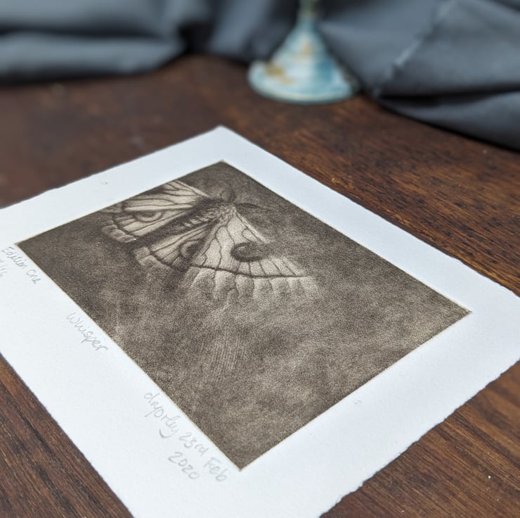 A small mezzotint of a moth, hand printed and signed. Edition of 16. The overall size of the work is 21x15cm and the image size is 9x14cm.