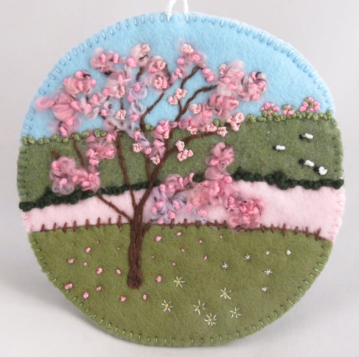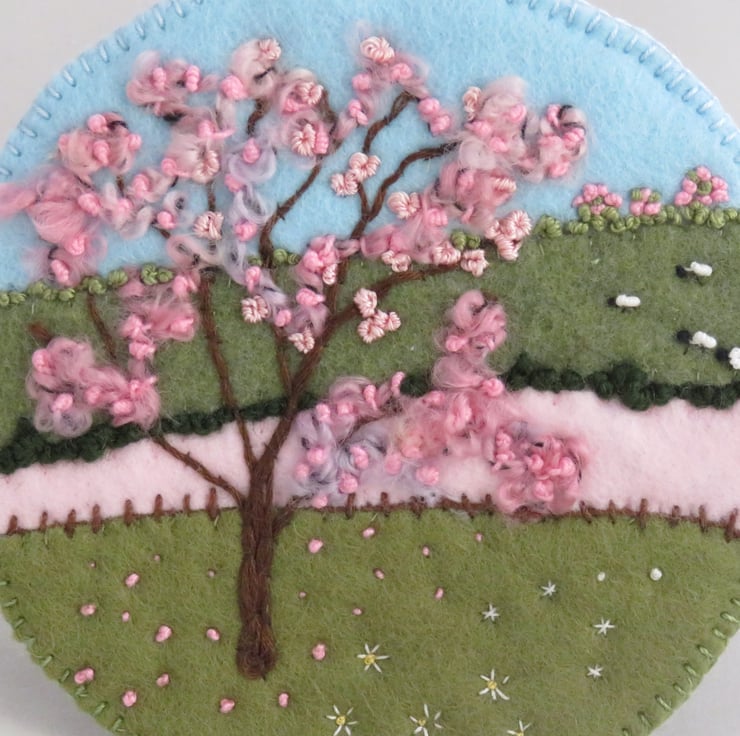 A pretty spring design featuring a cloud of pink blossom. Tiny diaies and very tiny sheep add further interest to the composition.