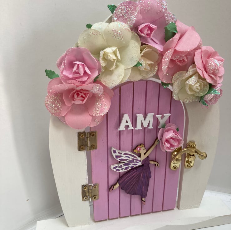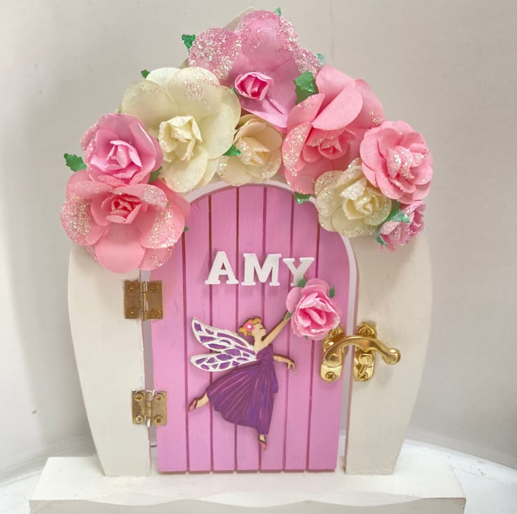 Hand painted in white and a lovely pink with glittery roses and a hand painted wooden fairy added to the door.