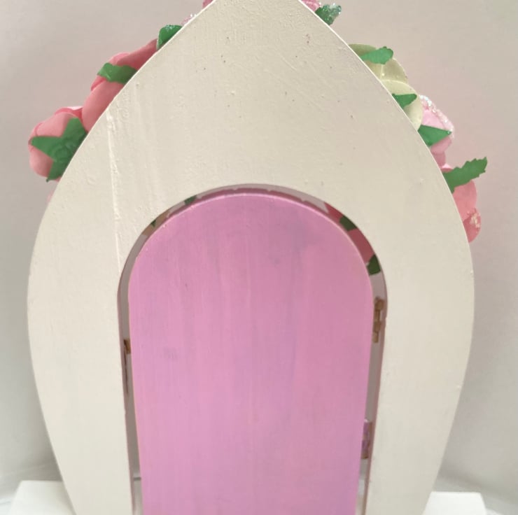 The little fairy is painted in irridescent colours of violet and pink with a pink flower in her hair, she is reaching up to place the last rose on the door.
