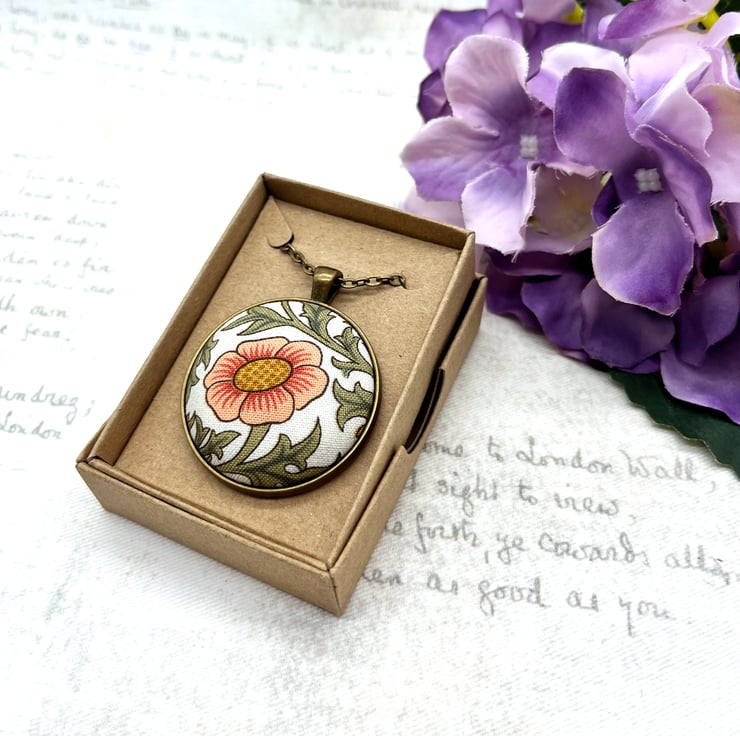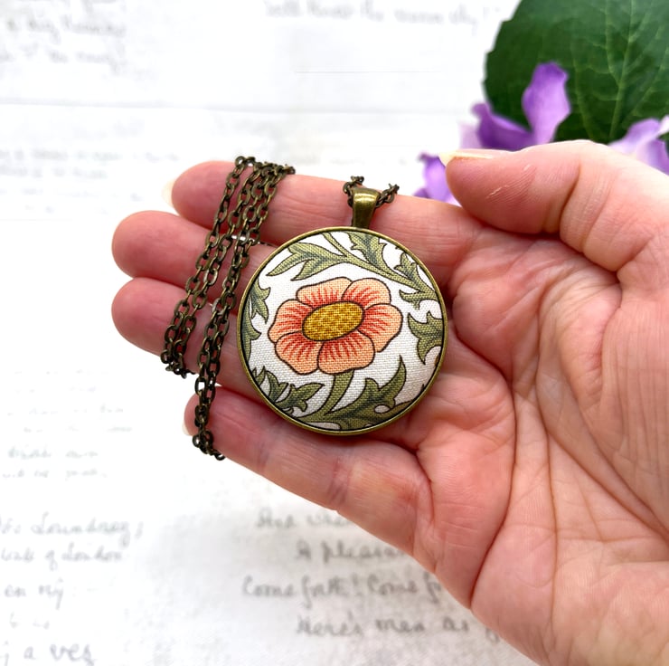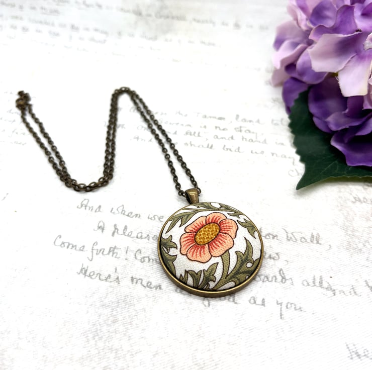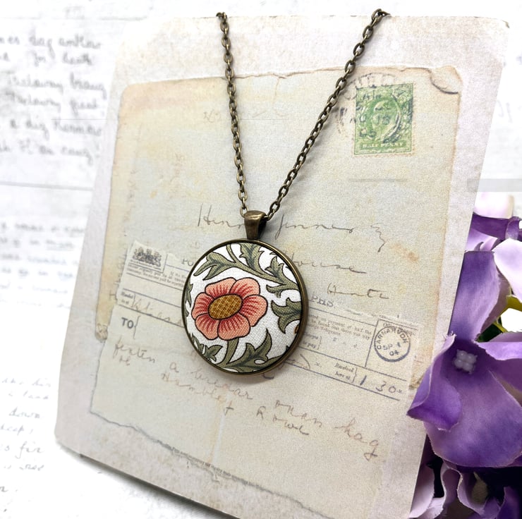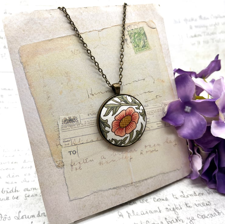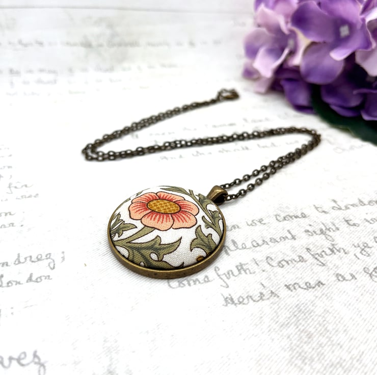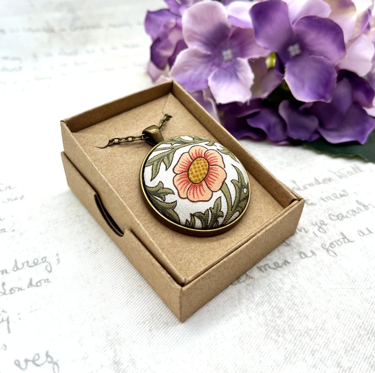 Taking inspiration from natural dyes and love of nature, this charming floral fabric button pendant is ideal for admirers of William Morris!