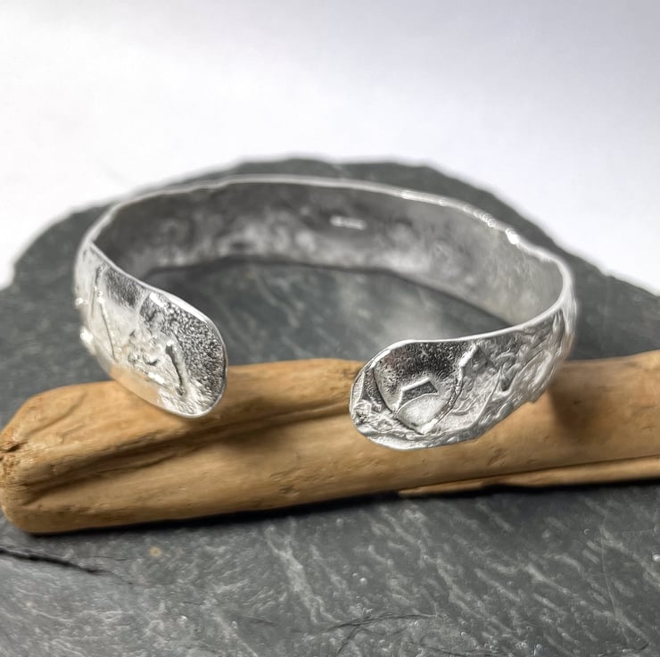 Hallmarked, recycled silver open oval cuff bangle with fused texture.