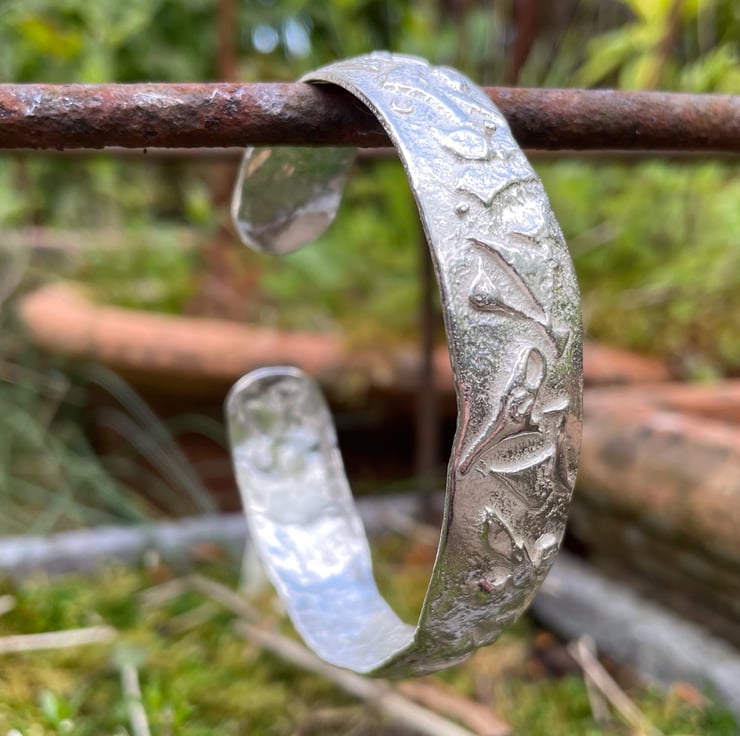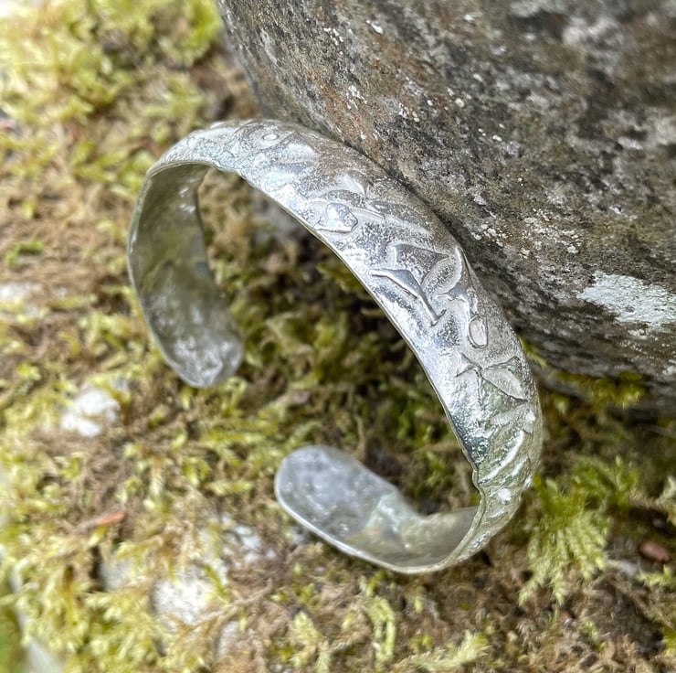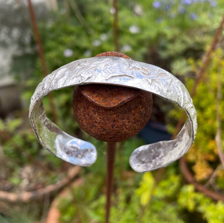 I have made this bangle by fusing silver off cuts to a strip of thick sheet, I have allowed the edges of the metal to melt a little, giving it a soft, organic, irregular edge to compliment the random pattern.