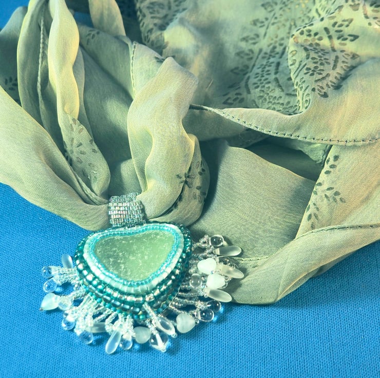 THis lovely piece of sea glass came from a local beach, it seems the sea makes heart shapes from broken glass fairly often, it's difficult to keep the heart shape when beading round them as the lobes at the top are quite shallow. I bought a few second hand scarves with the idea of putting the larger pendants on them, it makes an unusual necklace and balances the size of the pendant well.