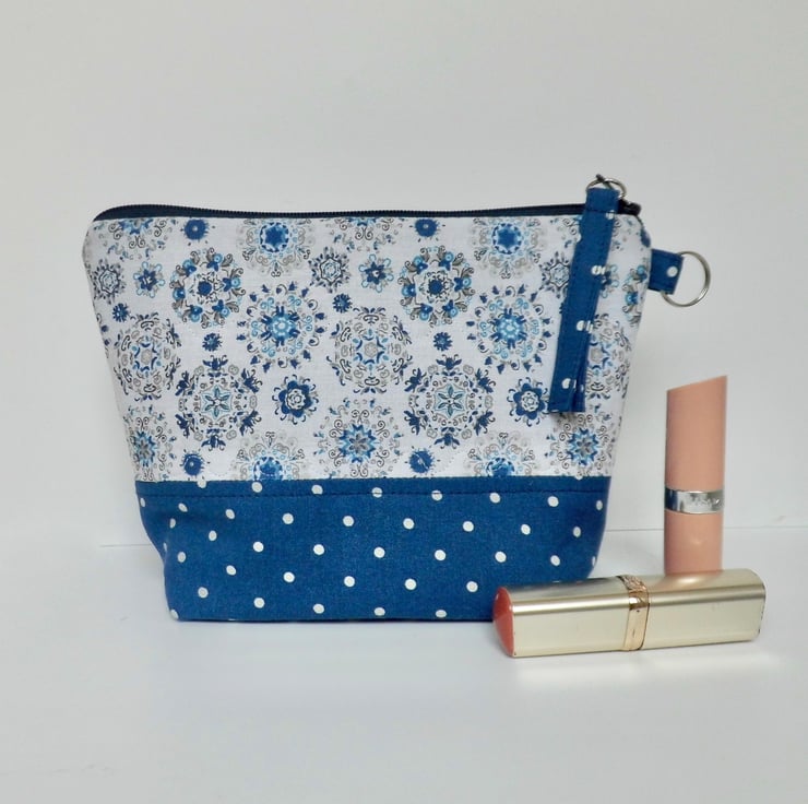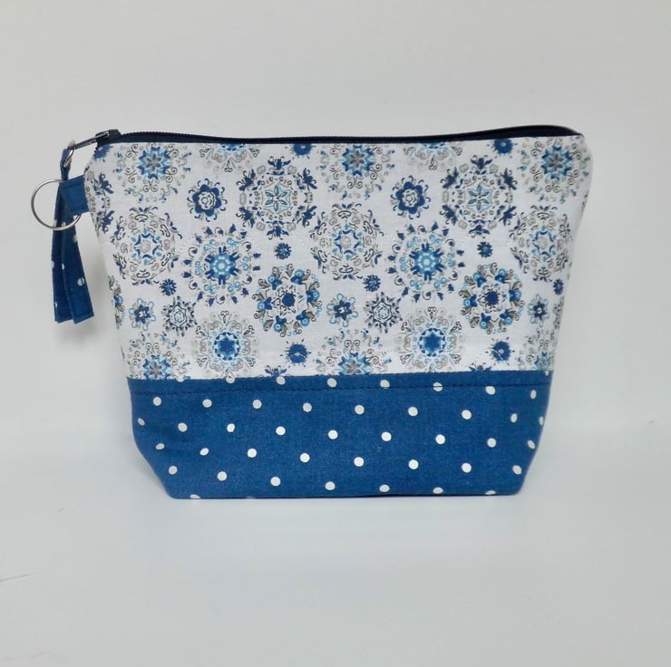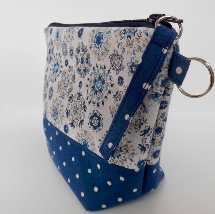 It has a navy blue zip across the top, finished with a fabric tab. There is a tab at the side with a metal jump ring, ready to attach a bag charm, keys or other accessories.