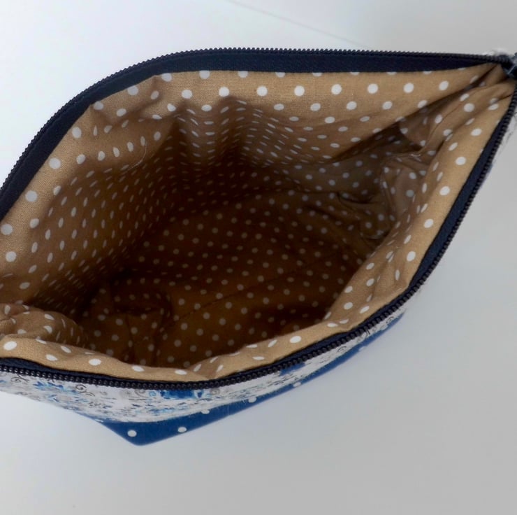 I made this zipped purse using two quilting cottons in coordinating blue and white. I backed this outer fabric with felt and wave stitched across the width to give it extra body and a quality feel. Inside is lined with coffee and white spotted fabric.
