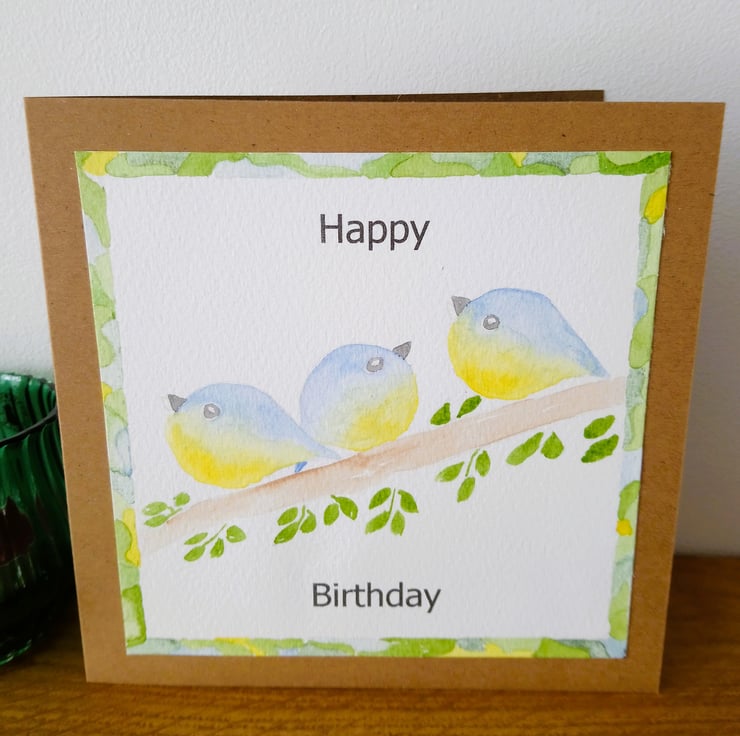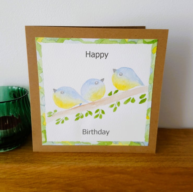 This bird inspired card has been hand painted in water colours of blue, yellow and green tones. The card is made from kraft coloured card and comes with a matching envelope.