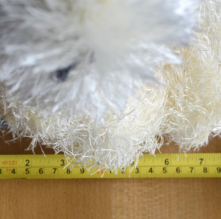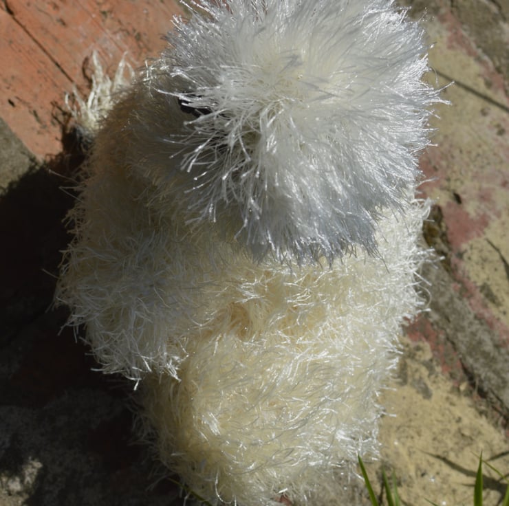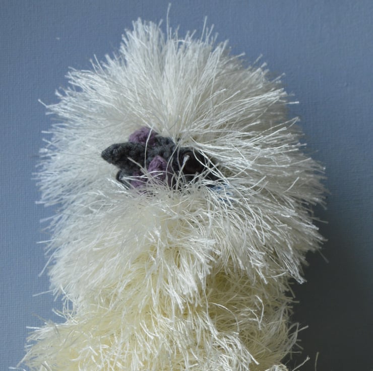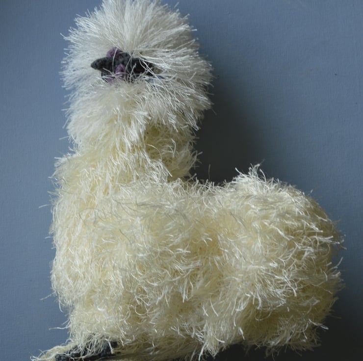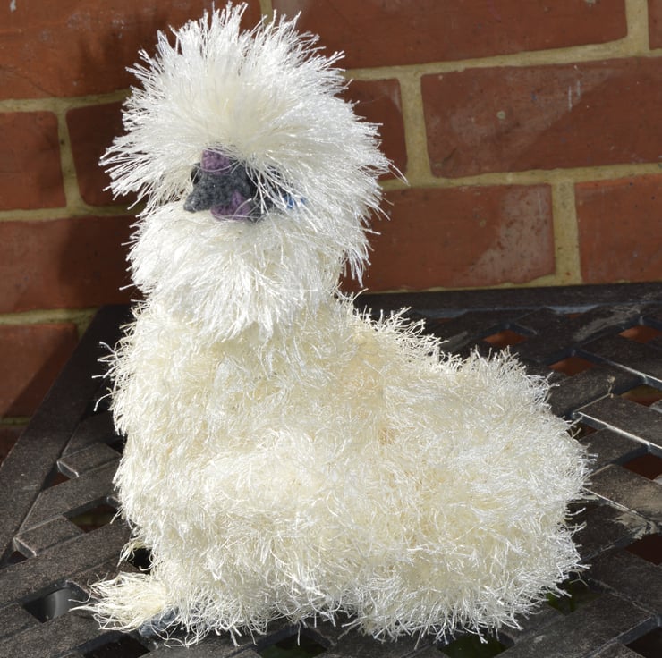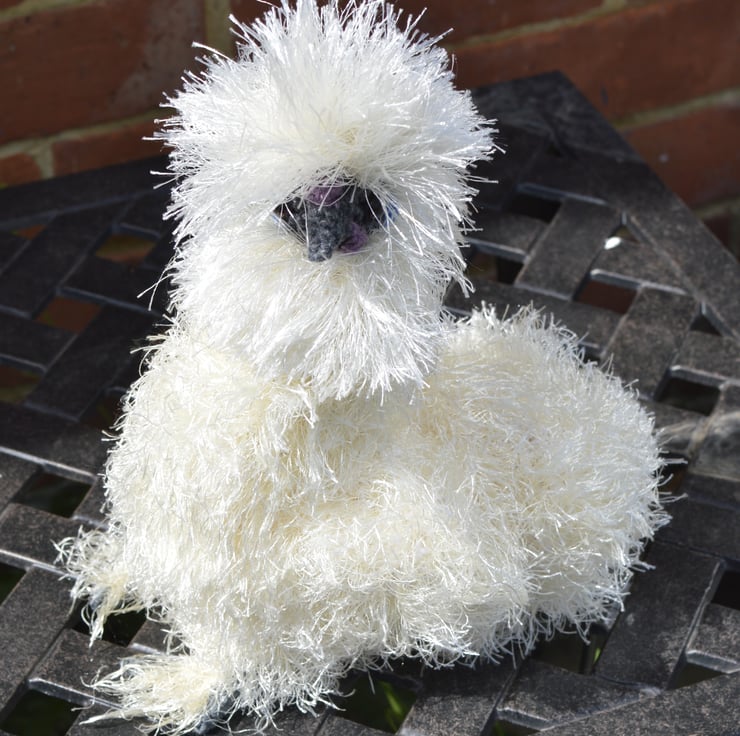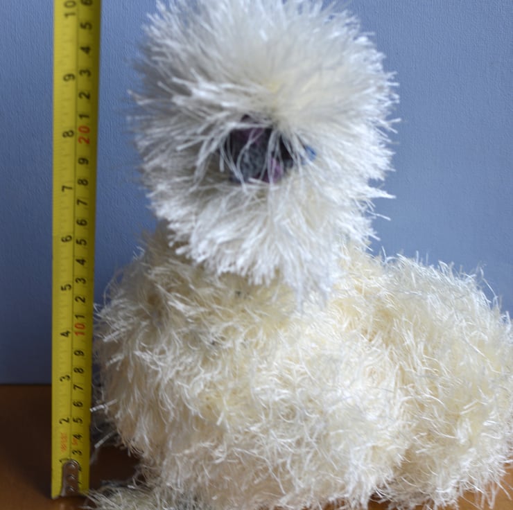 Cute crochet silkie which would make a lovely present for a chicken lover. The eyelash yarn is white on the head with cream for the body and tail. Filling is 100% polyester.and the chicken is crocheted from various yarn types including acrylic, cotton and polyester. The silkie is approximately 10.5 inches tall, 8 inches long & 5 inches wide. SAFETY ADVICE: Not suitable for a child under 3 years old as although fitted with safety eyes they are not suitable for that age group. Eyelash yarn could also be chewed by young children.